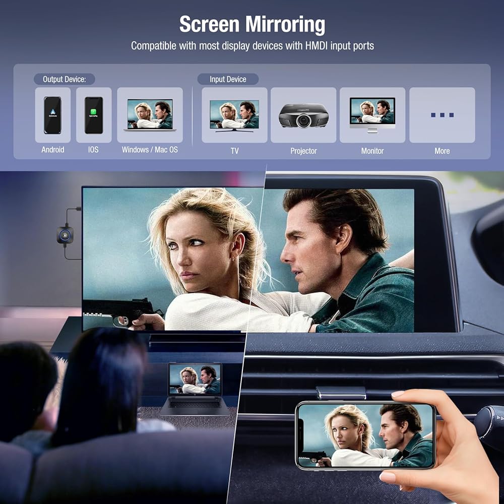 HDMI Display Cinema Mode and Screen Mirroring - This is the first magic box carplay dongle that supports screen mirroring to your car on the market at present. It supports ios, os, android, window devices. However, some applications will be limited by HDCP. ⭐Such as Netflix, Hulu, Spotify, Sky Go, or other HDCP copyright apps.But the HDMI theatrical mode is more than enough for your movie-watching experience.