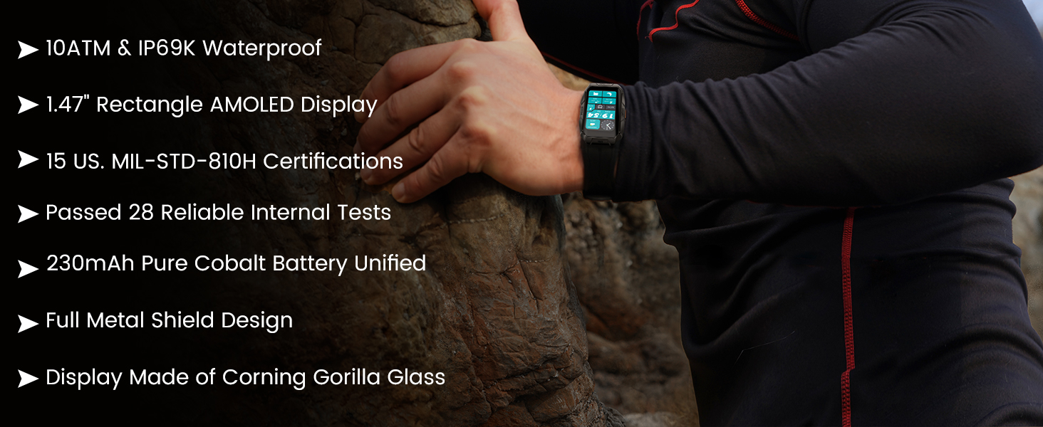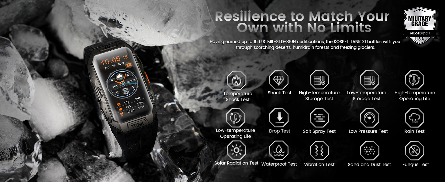🏊♂️ 15 U.S.MIL-STD-810H Certifications- KOSPET X1 fitness tracker has passed tests including high/low temperature storage testing, salt spray testing, low pressure testing, rain testing, solar radiation testing, impact testing, etc. The combination of the TC4 titanium unibody bimetal body, military-grade materials and fully enclosed design makes it the most rugged smart band ever made. Make this men's/women's smartwatch can withstand any harsh environment.