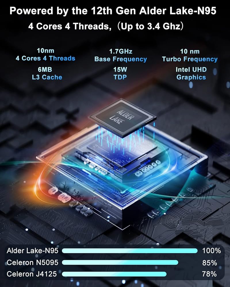 [Suitable Processor]: The mini computer adopts the 12th generation Intel Alder Lake -N95 processor, with 4 cores and 4 threads,base frequency of 1.7Ghz,burst frequency of 3.4Ghz, a power consumption of 15W, running smoothly. It is very suitable for daily work and learning!