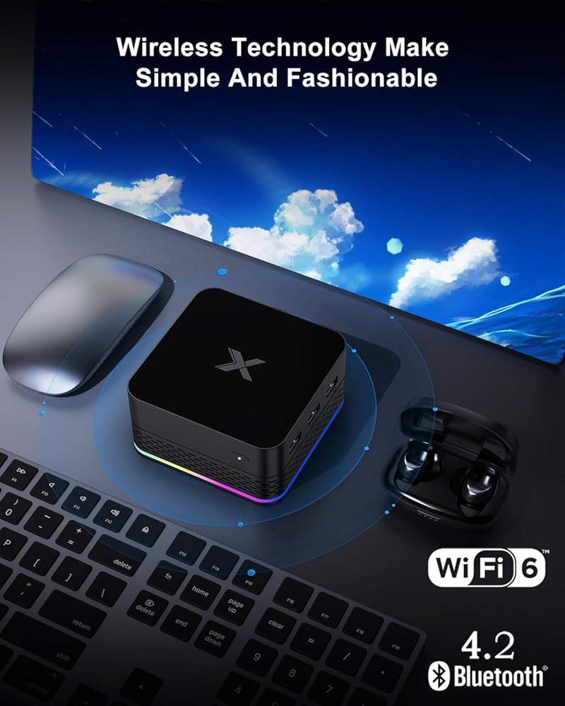 [Dual WiFi and Bluetooth 4.2]: Small computers support 2.4GHz 5.0GHz dual band WiFi and Bluetooth 4.2 support. You can connect a wireless keyboard and mouse, stereo or headphones, and more, making your work desktop clean and convenient to operate. At the same time, the mini computer is also equipped with adjustable RGB lighting, which allows you to set various modes and turn off the lights.