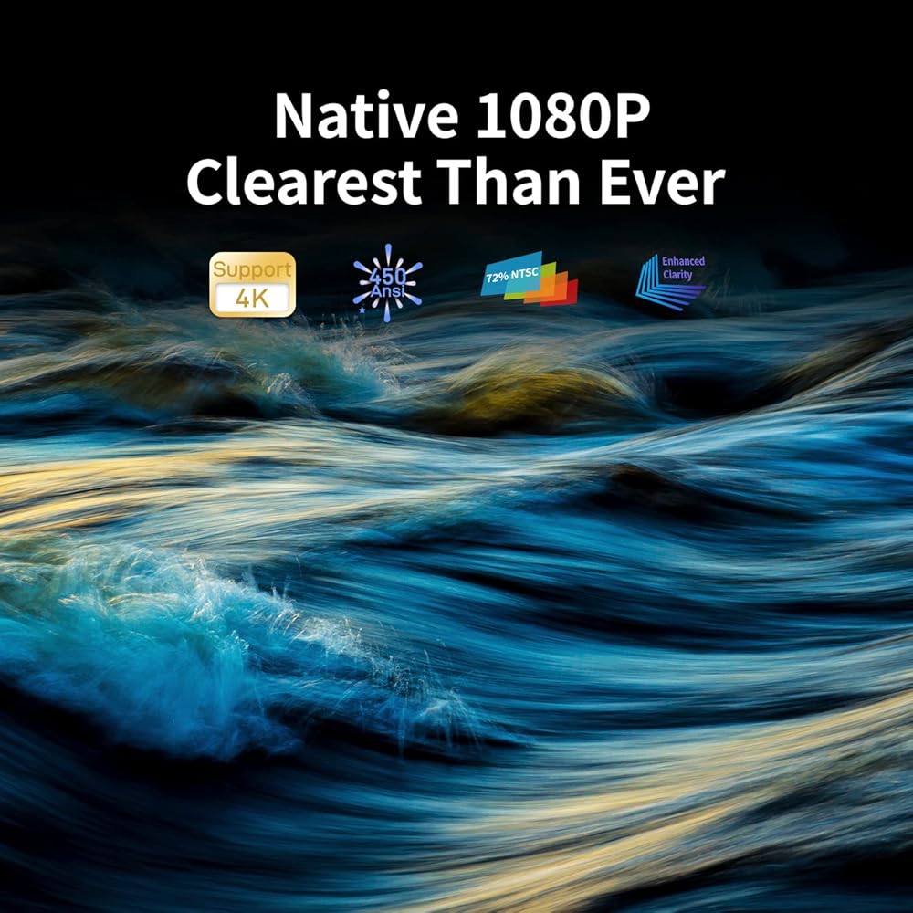 4K PROJECTOR with NATIVE 1080P FULL HD: clearer and shaper image, 12000:1 high contrast, the color gamut is up to 75% of NTSC and provides up to 17 million color ranges, can display 100% RGB color signals for each image. You can watch movies, sports events, games, shows, and more in incredible detail and clarity within vivid and deeper colors
