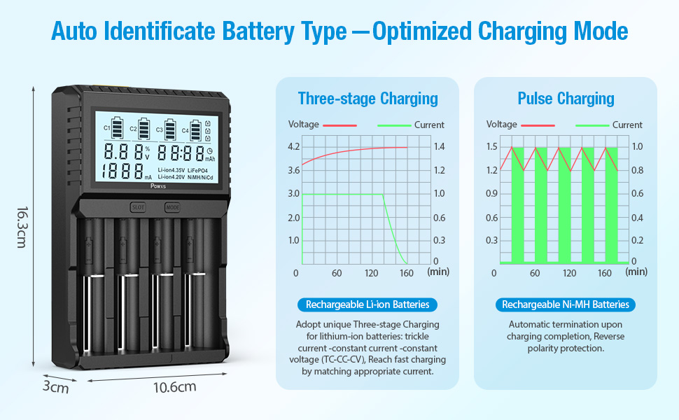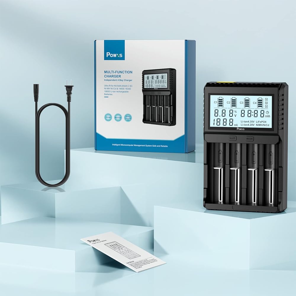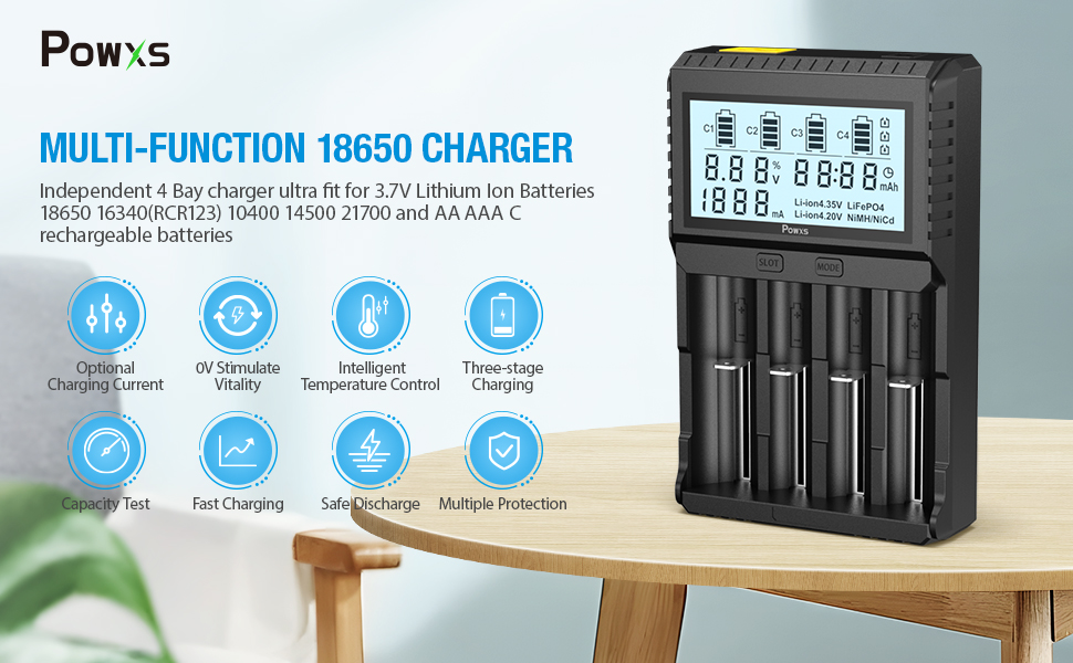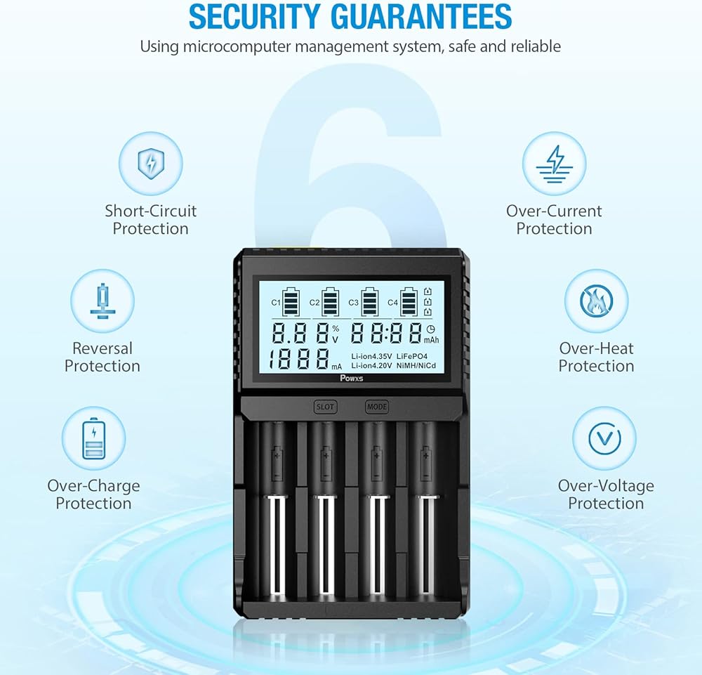 【Safety Assurance】POWXS R4 3.7v battery charger meets The UL Test standards, adopt the intelligent microcomputer control system, to keep your battery away from over-voltage, over-charging, over-current, short circuit, reverse connection, etc. safe using every day.
