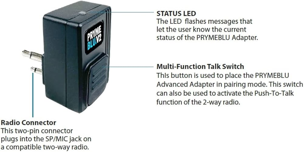 Several Push-To-Talk options: use the PTT button on the PRYMEBLU adapter to initiate transmissions, or use an optional PRYME wireless PTT