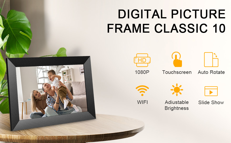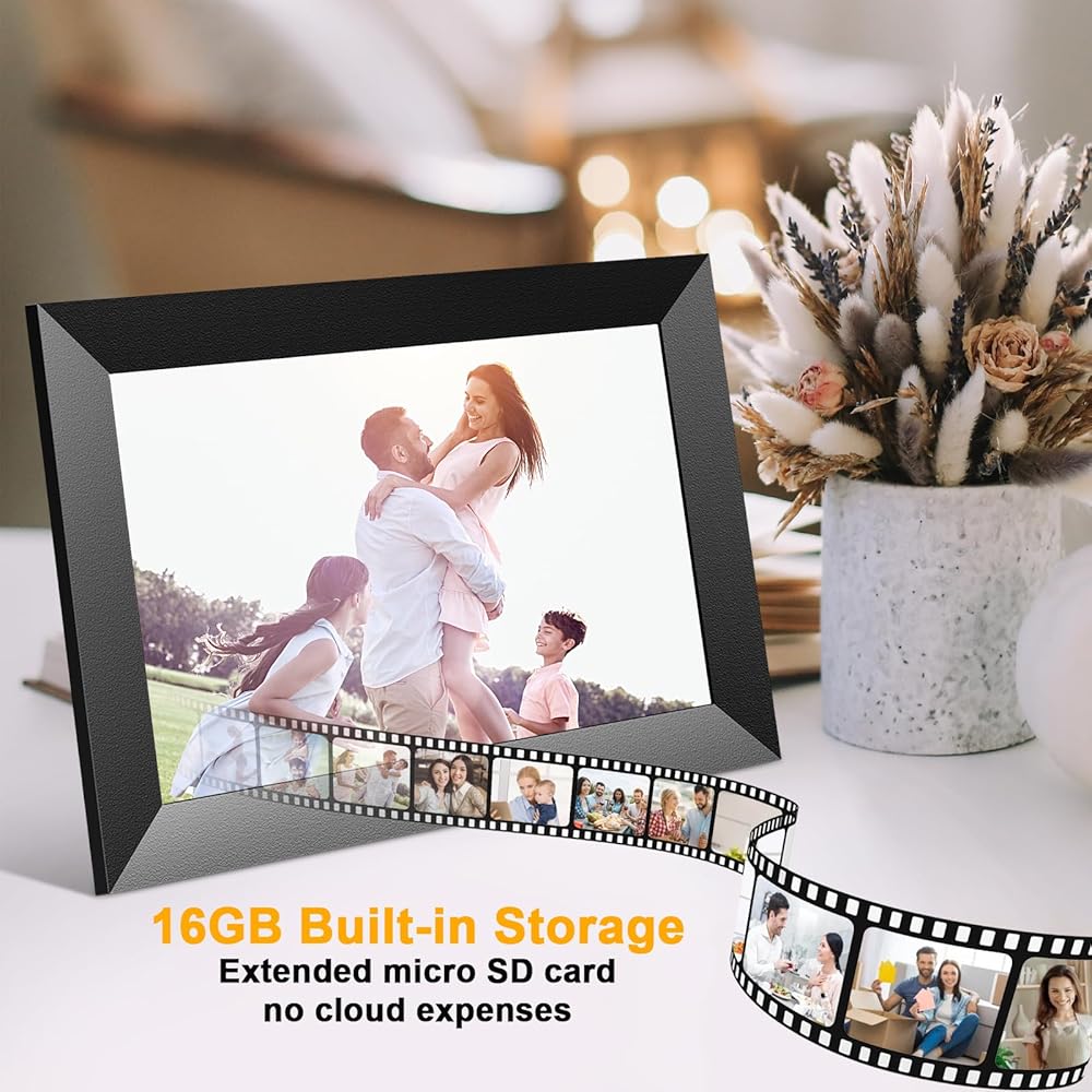 【Professional and Friendly Design】The WiFi Photo Frame provides many custom settings, photo hiding, photos and videos slideshow time, etc. Digital picture frames can automatically rotate photos to adjust the direction, which allows you to place the WiFi digital photo frame in either portrait or landscape mode or on the wall. Built-in 16GB memory empowers a huge capability of storage.