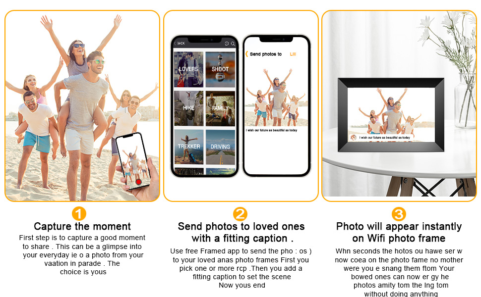 【Share Photos Videos Securely Privately】Send photos or small videos to the free "Frameo" APP from anywhere in the world, friends and family can enjoy your wonderful moments within seconds on the Picture frame. The ''Frameo'' App for iOS and Android gives you full control over your frame. Built-in 16GB memory, supports Mirco SD Card (Max.128GB) extend storage, and also can import and export pictures or videos.