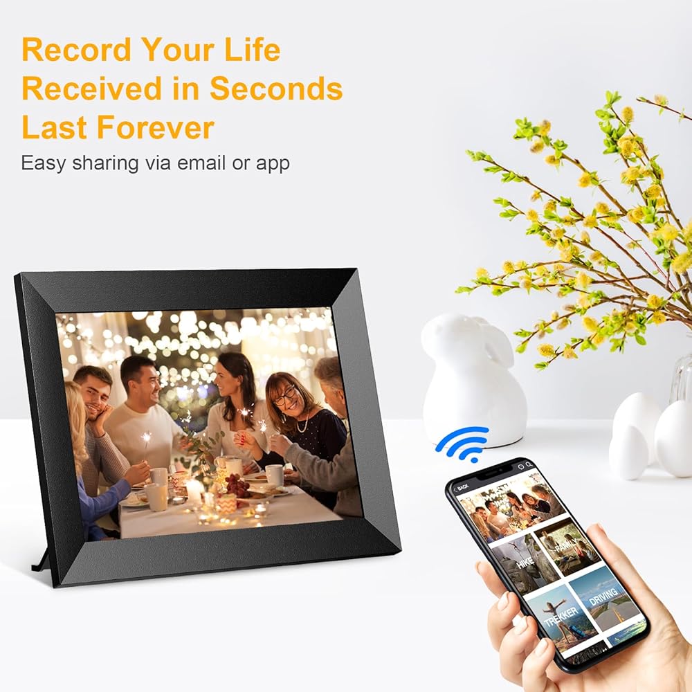 【Easy to Use and WiFi Sharing】User-friendly interface design makes it easy to use for all ages. Only a few steps to complete the setup and an intuitive touch screen makes the usage much easier than ever. This digital WiFi photo frame is like your home inbox and anyone can send photos and videos to it after getting the unique code. There is a notification when new photos arrive, so you won't miss it.