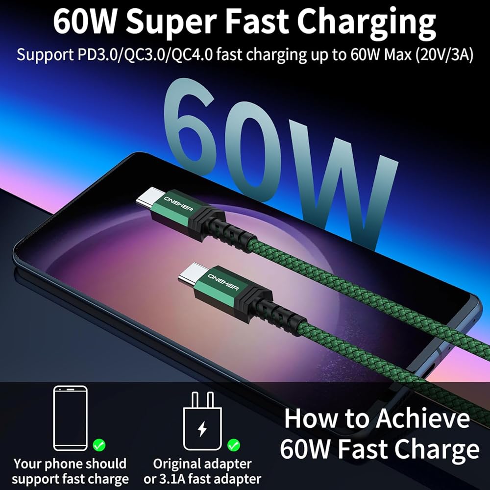 【USB-C to USB-C Cable】This is a USB-C plug with the same ends, Not USB-A to USB-C cable, designed for Fast Charging up to 60W and Data Transfer,so you need a USB-C wall charger to charge your device.