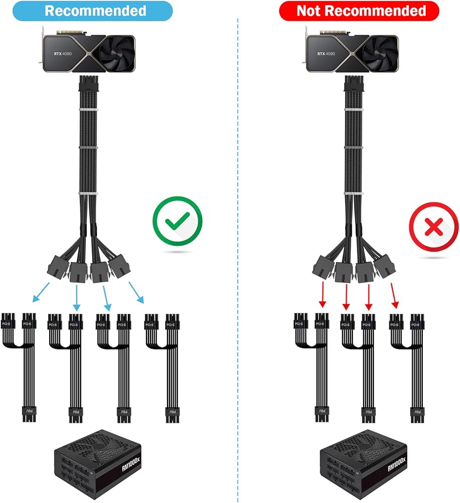 【Simple solution】This extension cable only needs to connect 4 8pin to convert it into 12+4pin, which is simple and safe to power the GPU. It is recommended to use a power supply above 1000W for better and more stable performance. Note: Do not use PSU 8 Pin to Dual 6+2 Pin PCIE power cable as two connection ports to avoid overload power supply problems. We recommend using 4 PCIE power cables for better and more stable performance.