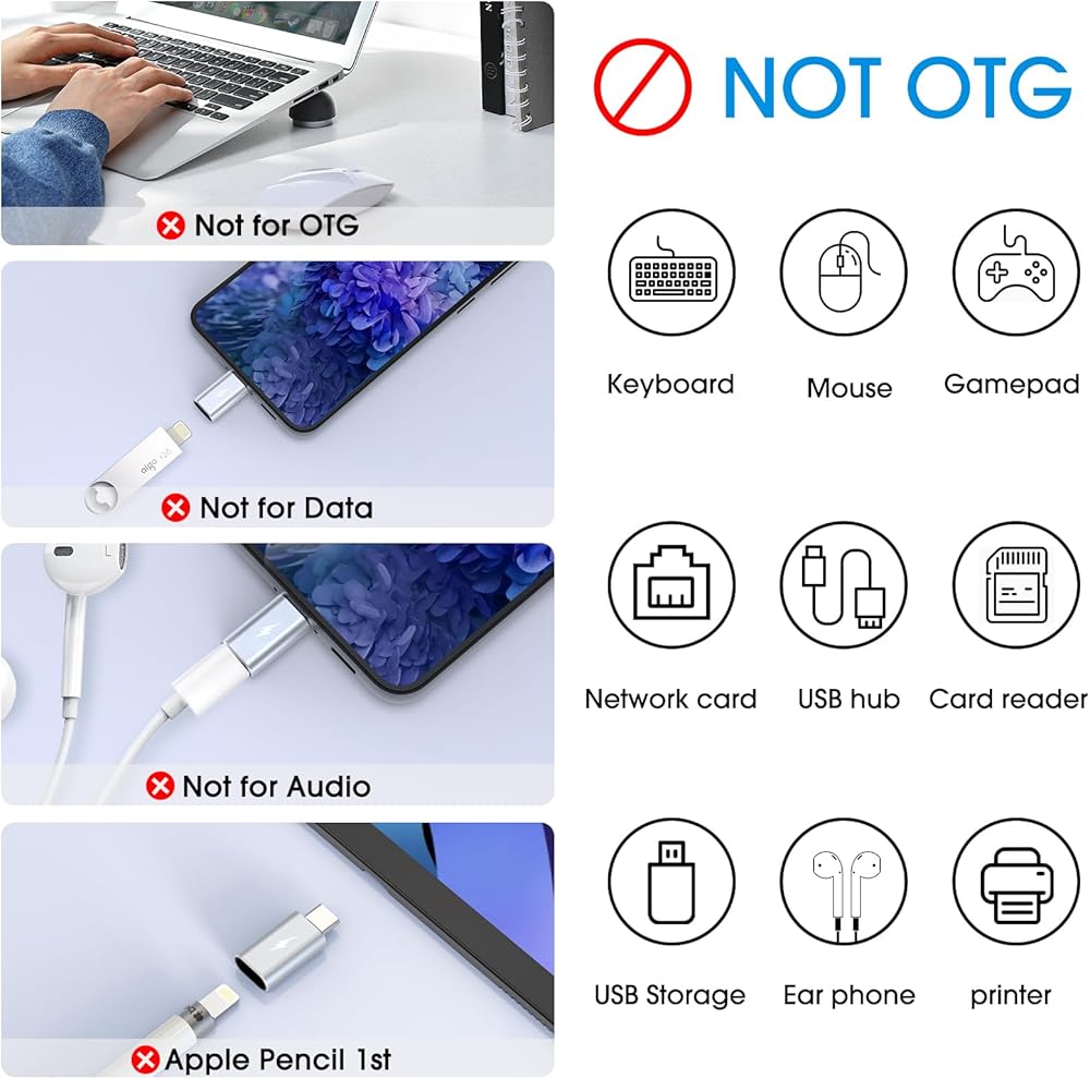 【Transfer Data Adapter】The apple lightning to type c adapter is compatible with Usb-C/Usb-A to lightning cable, but ONLY USB-C TO LIGHTNING CABLE CAN BE USED TO TRANSFER DATA with this adapter. NOT fits HDMI and Apple pencil. NOT designed for OTG, Car Play, Card Reader, Headphones, Microphone, MIDI Keyboard, Mouse, Hubs, USB Flash Drive, U Disk, Camera, etc.