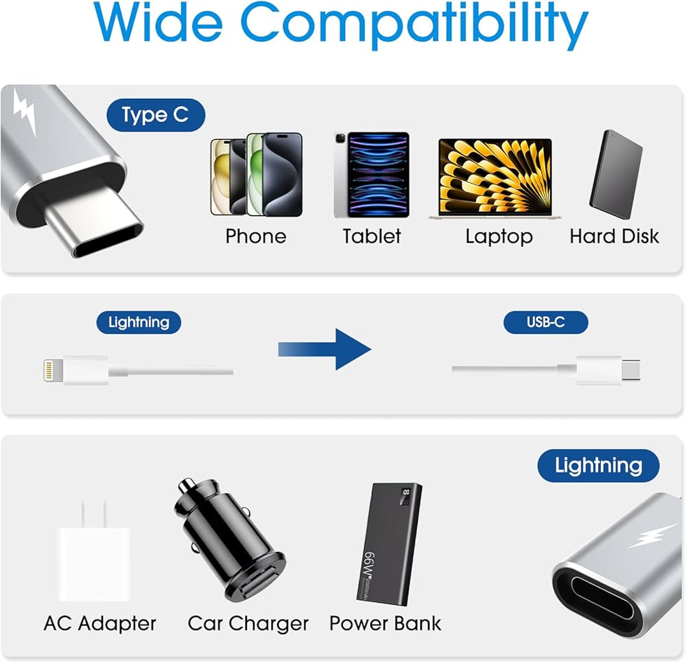 【 Adapter for Type C Devices】 The lightning to usb c adapter supports fast charging to type c devices, saves more time for you. Just need one adapter to charge your type C devices with IOS cable. Compatible with iPhone 15 Series /iPad/MacBook/Tablet/Laptop/Samsung /Google /HP/Redmi /Xiaomi/OnePlus/LG/HTC/Surface and other devices with Type-C port.