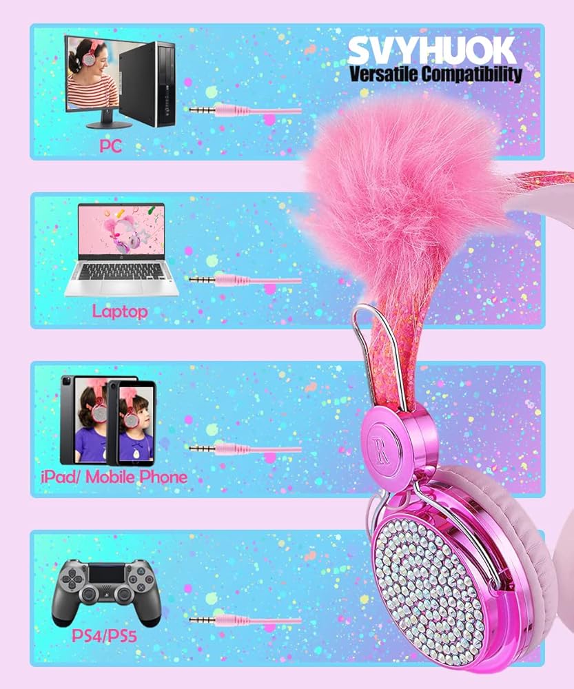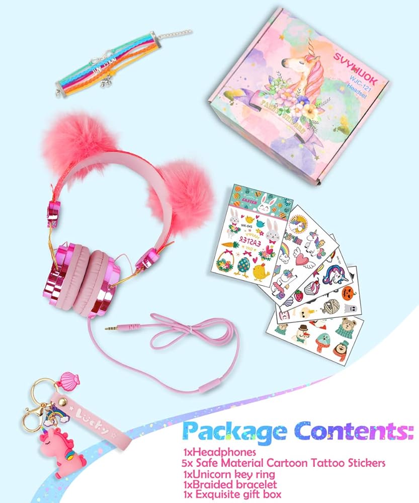 【🦄Unicorn cat ear design---Let the child like it very much💙】The unicorn and cat ear shapes of this pink Headset are made of glittering PU leather and unicorn color.At the same time,the earmuff shell is full of shiny rhinestones, which is very cute and charming. A gift box with a unicorn pattern,cartoon tattoo stickers(unicorn pattern*2,Christmas pattern*1,Halloween pattern*1, Easter pattern*1) and a unicorn woven bracelet are provided.A gift box full of love,It is the favorite of girls.