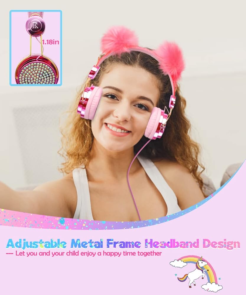 【🦄Excellent Audio quality】: The cat ear headphones are capable of Crisp,clear sound and bumping bass which make for a complete surround sound experience,provide maxmium listening enjoyment for your kids and allow them indulge in music,audiobooks and multiple learning resources in comfort.