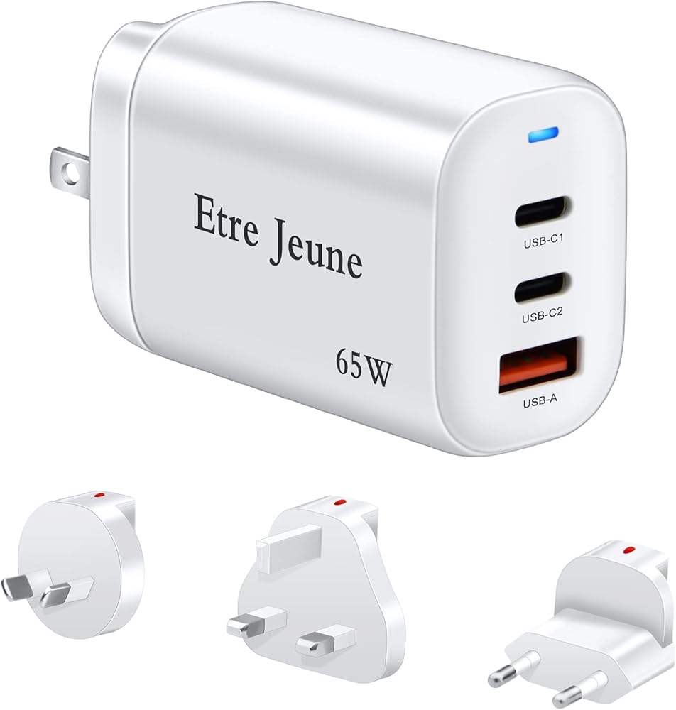 65W USB C Charger, Etre Jeune 3-Port GaN Charger PD & QC3.0 Fast Charger Compact Foldable Wall Charger Compatible with Mac Book Pro/Air, iPad Pro, World Travel Adapter Kit US to UK, EU, AU