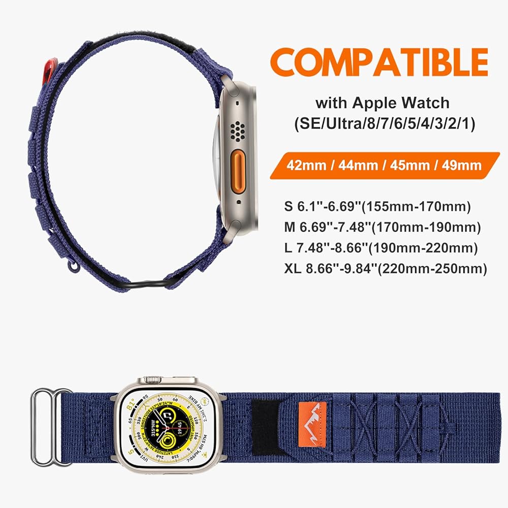🏄【Four Sizes to Fit Different Wrist】The nylon sport bands compatible with Apple Watch bands 44mm 45mm 42mm 49mm has been designed four sizes to fit different wrist. S: suitable for 6.10"-6.69"(155mm-170mm) wrists M: suitable for 6.69"-7.48"(170mm-190mm) wrists, L: suitable for 7.48"-8.66"(190mm-220mm) wrists, XL: suitable for XL 8.66"-9.84"(220mm-250mm) wrists. Please check the bands size carefully before buying the bands to avoid buying the wrong size