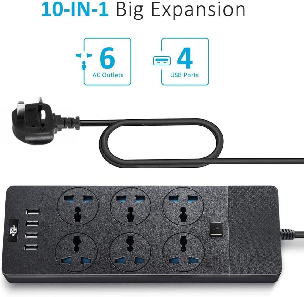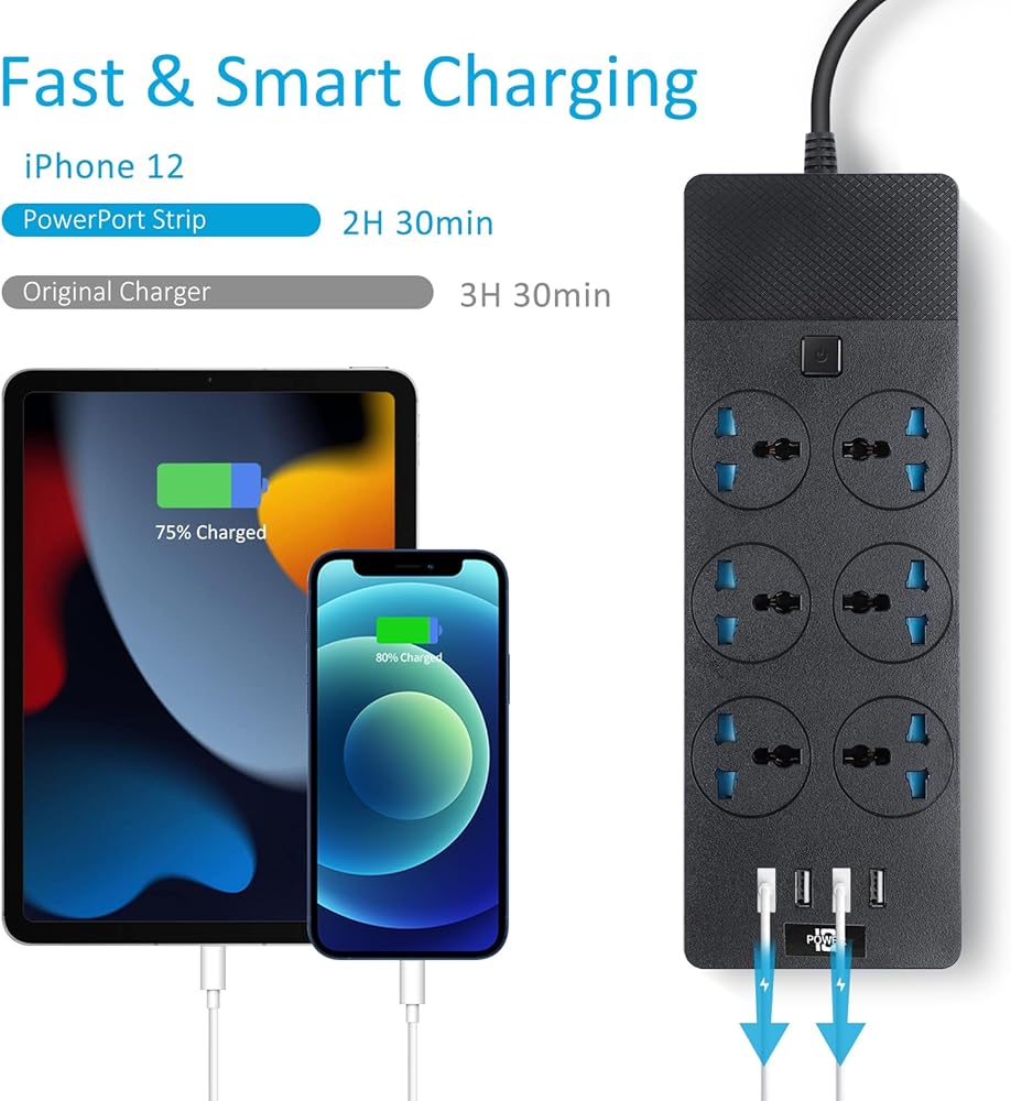🔌【Smart USB Charging Ports & Quick Charging】 - Long universal power strip surge protector with 4 smart USB ports. Each USB port has a speed of up to 5V/3.1A (max). Power strip with USB ports can automatically adjust the charging speed so you can charge your phone, iPad, tablet and other devices.
