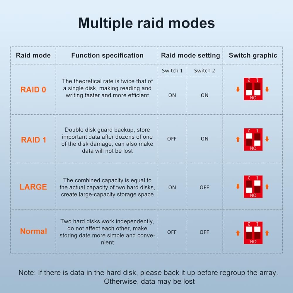 Easy Storage Mode Switch: Easily switch disks by mode toggle switch, with options for JBOD (PM), RAID 0 (FAST), RAID 1 (mirrorSAFE) modes. Say goodbye to driver installation and cumbersome software setup.