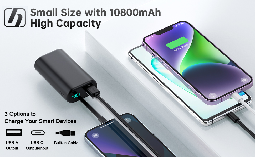 【3 Outputs and Smart LCD Display】This portable charger not only built-in-cable ,but also is equipped with a USB-A output and USB-C output .So it can charge up to 3 devices at the same time.Smart LCD digital display can easily track the status of your charge,Just push the button to see how much power you have left.
