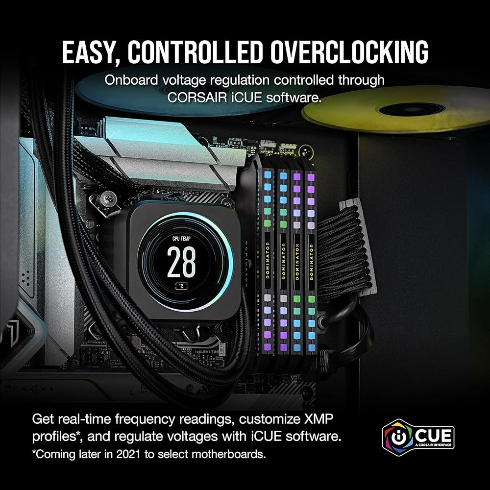 Powerful CORSAIR iCUE Software: Enables dynamic RGB lighting control synchronized across your entire iCUE setup, real-time temperature and frequency readings, onboard voltage regulation, and custom XMP profiles.