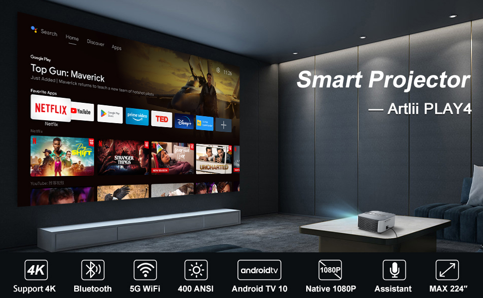 【🔥Buillt-in Chromecast Function】With the latest built-in Chromecast technology, you may put most apps which are protected by copyright from phone/tablet/laptop mirroring directly on the projector. Most projectors can only simply mirror the contents of iOS/Android!Also the 5G Wifi capability of the Artlii Play4 will upgrade your movie watching experience!