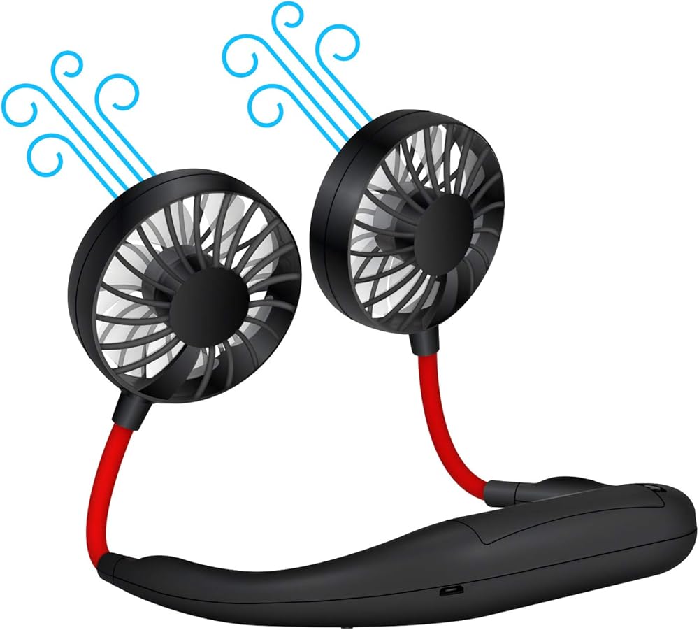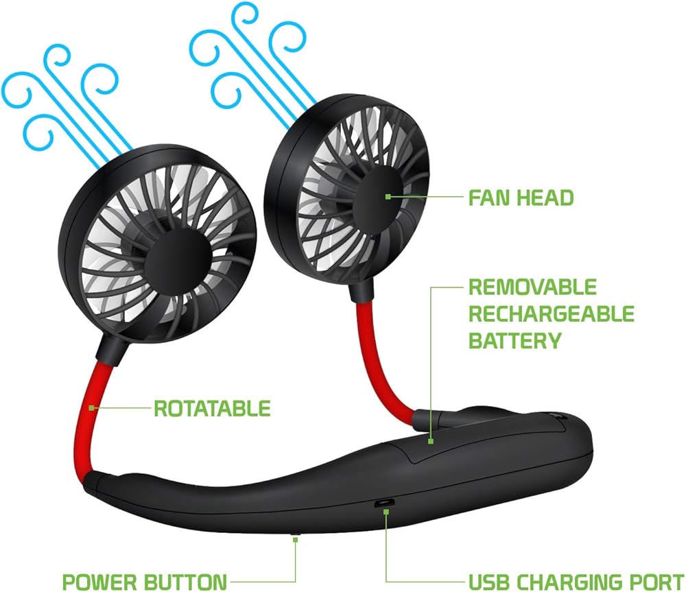 Keep cool as you travel, go camping or attend a concert during a hot summer day with the Hands-free personal cooling fan. Hang the hands-free USB Rechargeable fan on your neck and watch movies comfortably as you lay down. The soft flexible foams protects your neck from any discomfort. Small but efficient when operating, the fan makes minimal noise making it easy to use anywhere, even indoors. This hands free fan is extremely useful when participating in any outdoor activities or for a daily basis. Its innovated folding design makes it easy to store and carry, when traveling. To begin using, simply hang fan on your neck and press the on button. Press on button once for low speed, twice for medium speed and three times for high speed. 360 degree rotation allows you to set fans at any angle. The hands free personal fan allows you to keep cool without the hassle having your hands occupied. Keep cool as you enjoy outdoor activities without the hassle of having your hands full. The hands-free neck fan allows you to continue with your day to day activities without any inconvenience. Built with an 1800 mAh long lasting battery, battery life is approximately 4 to 12 hours. Charging cable is included inside the box (AC adapter sold separately). Charging time: approximately 4 hours. With the touch of a button, adjust the wind to your own liking. 3 different speed levels: low, medium and high. Press on button once for low speed, twice for medium speed and three times for high speed.