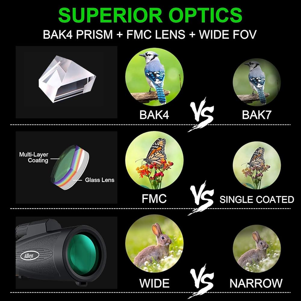【16X55 High Power Magnification】A full 16x magnification and 55mm object lens diameter monocular, provides a clear and bright image, enjoy the beauty of the distance.Allkeys monocular telescope has a large field of view (285ft 1,000Yds), bring you the best view in your outdoor adventures, Perfect for hiking, hunting, climbing, bird watching, ball games, concerts, watching wildlife and scenery.