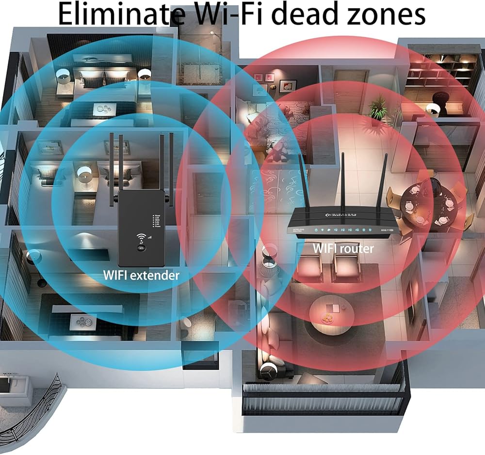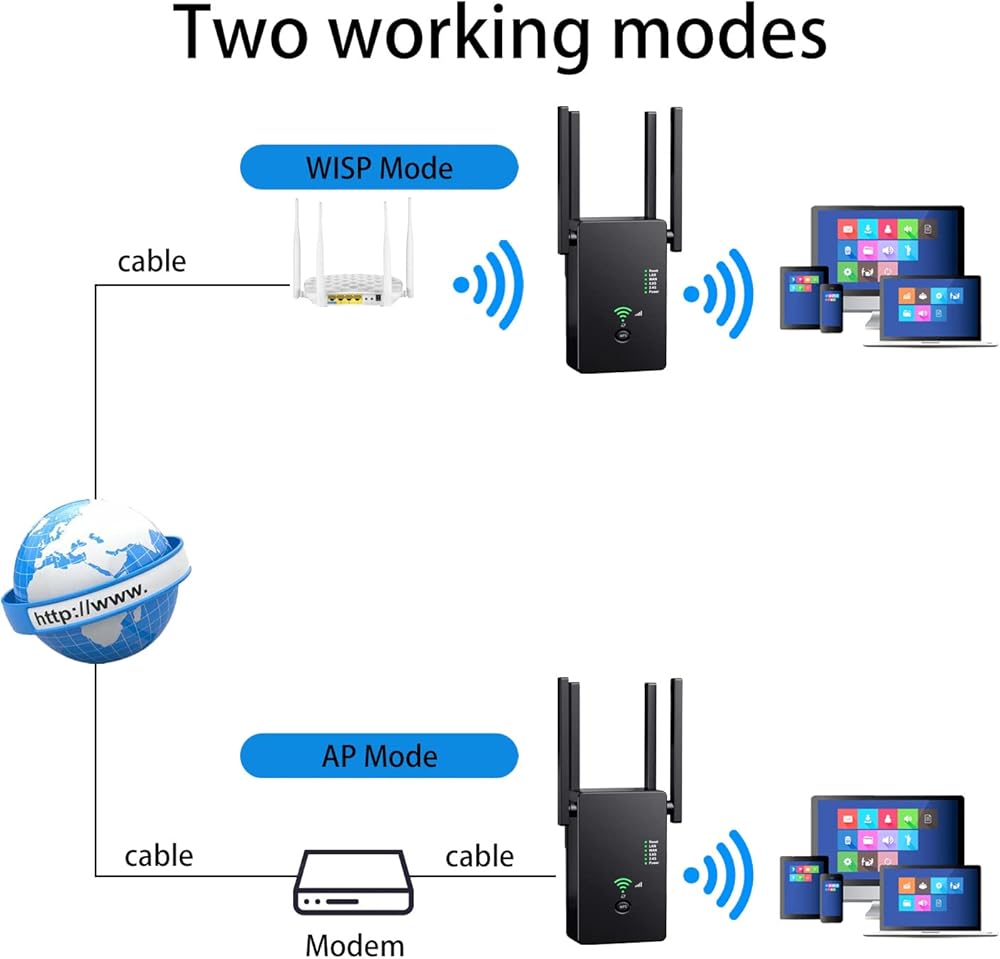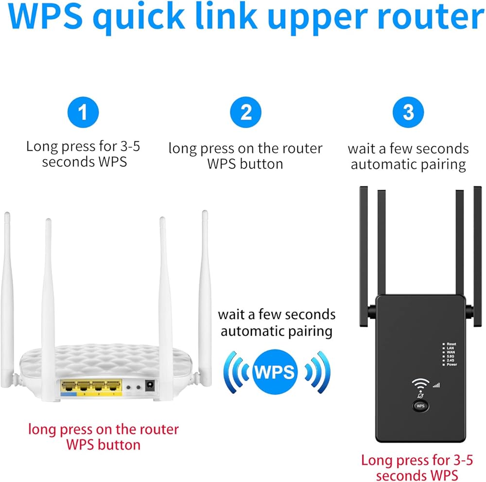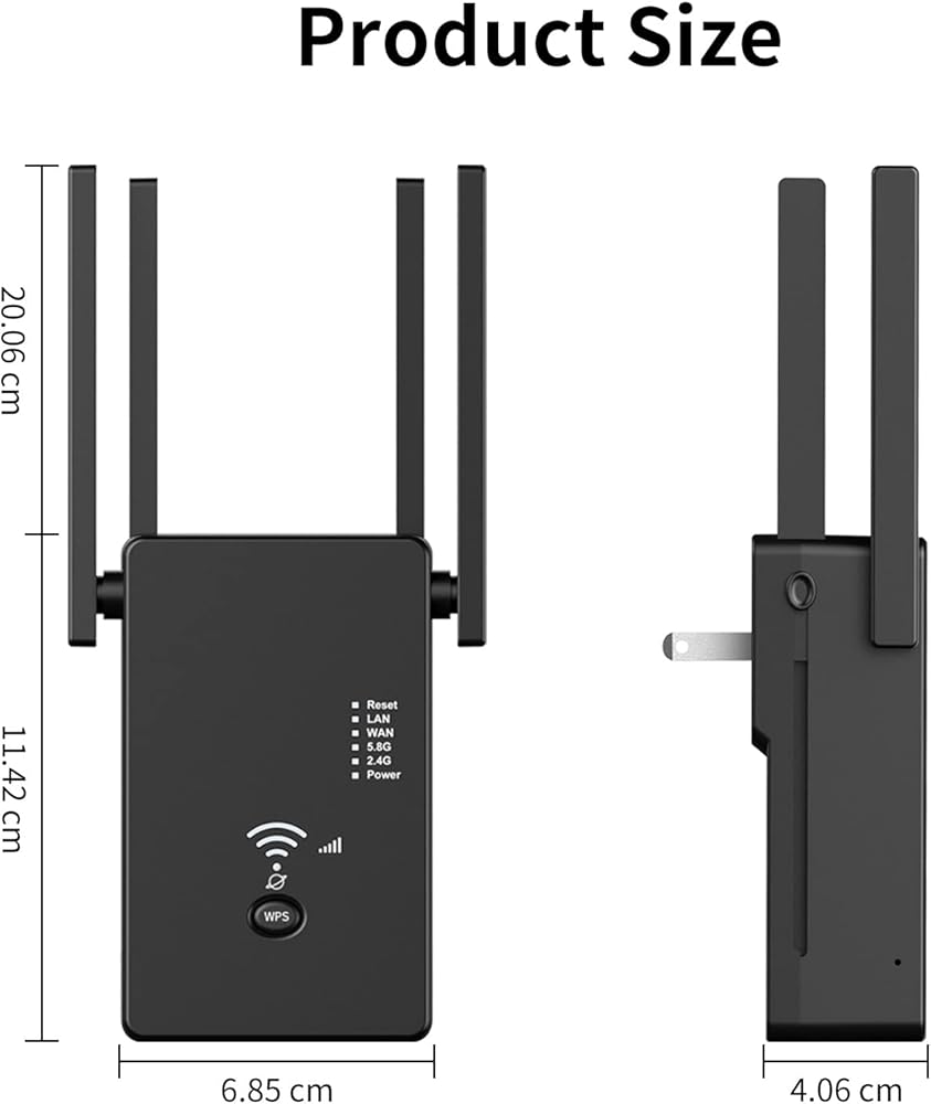 Dual band technology (2.4GHz+5GHz), four external antennas can provide the best performance, expand your existing WiFi coverage by 1200mbps, and the wireless signal expander has a wide coverage, convenient installation, fast speed, and high security