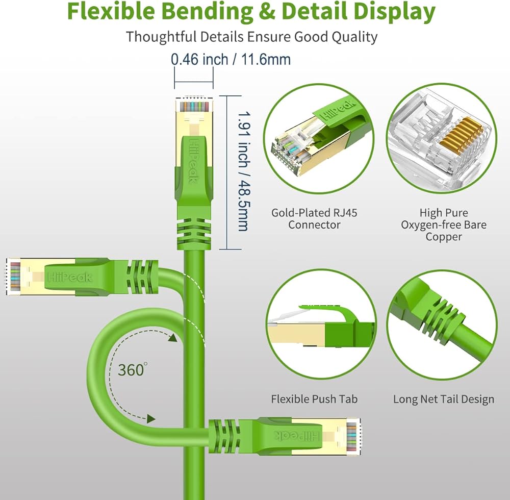 🚀 أكثر متانة وعمر افتراضي أطول: تعتمد كابلات الإنترنت HiiPeak أسلاك نحاسية نقية ومقابس RJ45 المطلية بالذهب تتميز بمقاومة التآكل والأكسدة وأكثر حساسية. تستخدم الطبقة الخارجية جاكيت من بلاستيك بي في سي بسمك 0.8 ملم، ومواد فاخرة لضمان جودة تدوم طويلاً وأداء أفضل.