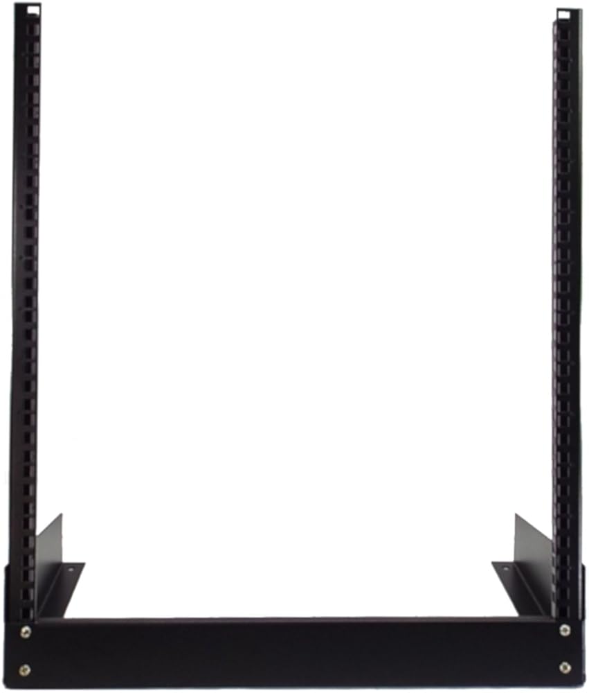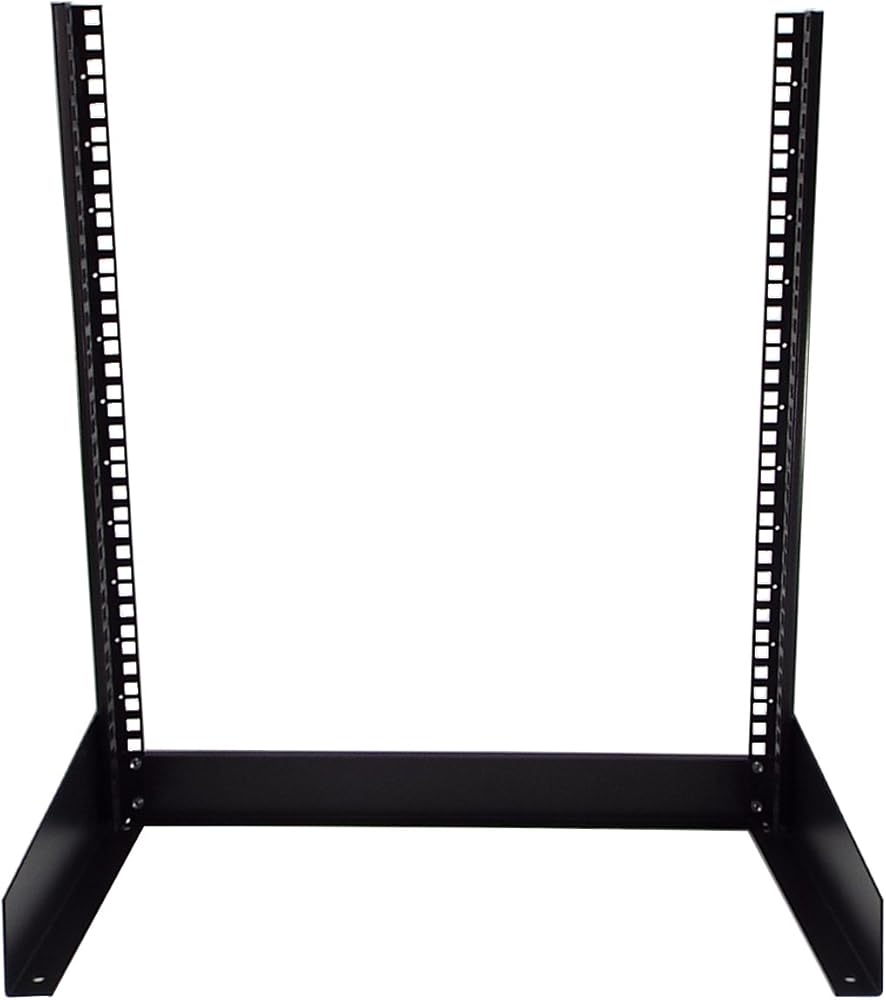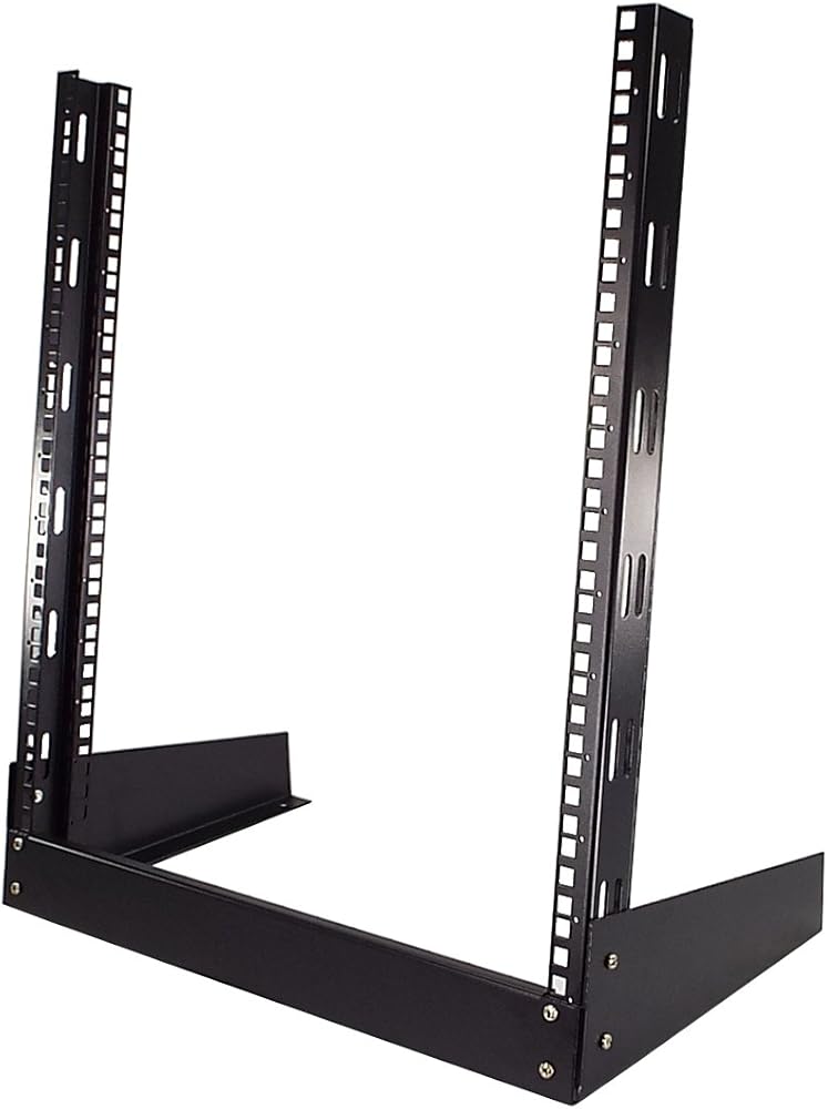 The Open Frame 8U 2 Post Desktop Rack is an efficient way to rackmount shallow equipment while taking up little space. Rackmount shallow EIA 19" equipment, such as switches, patch panels, small office equipment, and audio/visual equipment. The open frame allows beneficial ventilation and an easy access to mounted hardware for maintenance. The two uprights include universal square holes for universal mounting. Hardware is included.