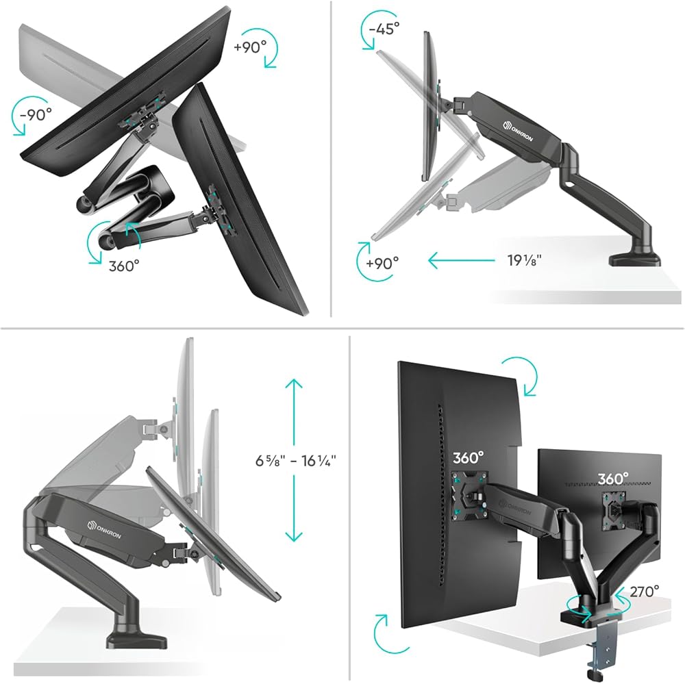 FULL MOTION DUAL MONITOR MOUNT | Our monitor arms for 2 monitors support an up-down tilt from -45° to +90°, left-right swivel 180° and 360° rotation | Rotate dual monitor desk mount into landscape or portrait view | Fix PC monitor mount in any position on your eye level to achieve the best possible comfort with the desk monitor arm