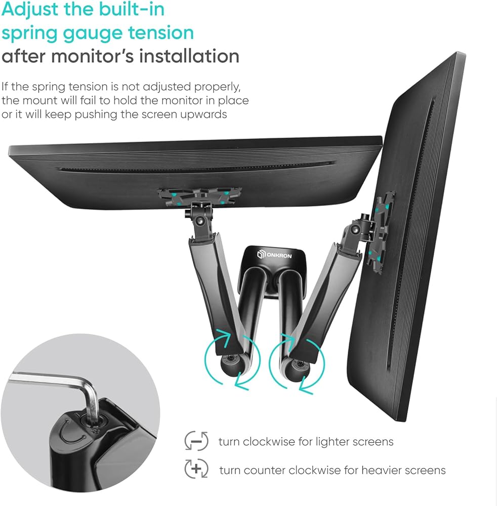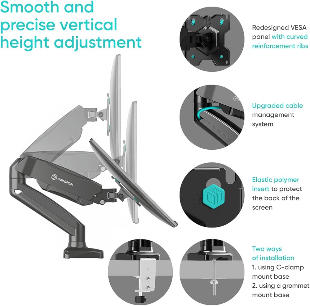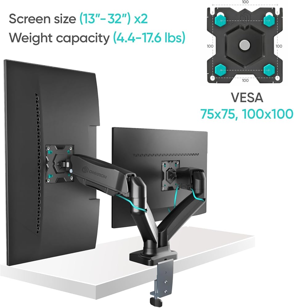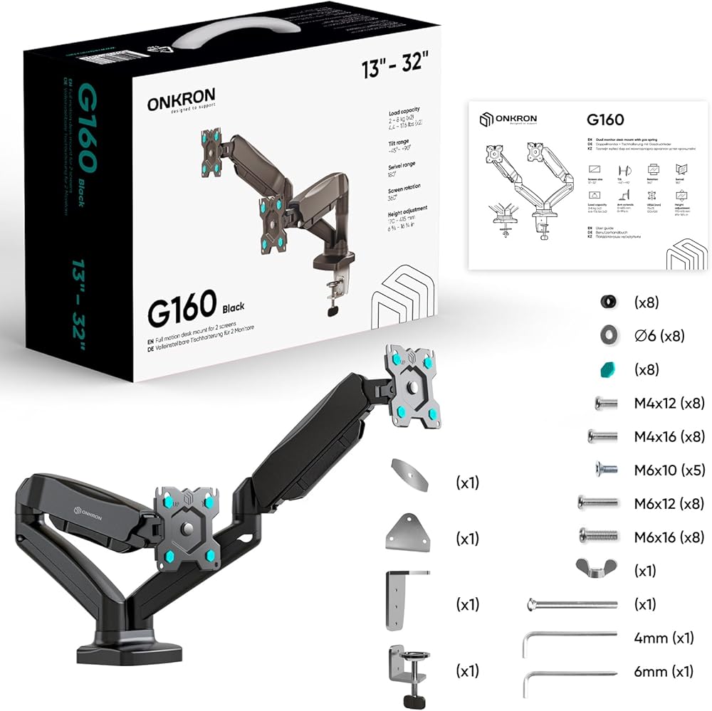 2 MONITOR MOUNT | ONKRON G160 is a computer monitor arm dual ideal for two 13" - 32" screens, TVs, and monitors that weigh 4.4 - 17.6 lbs each | This dual vertical monitor mount is compatible with 75x75 mm - 100x100 mm VESA mounting holes | Gas lift system withstands over 50.000 load cycles making this two monitor desk mount a durable option