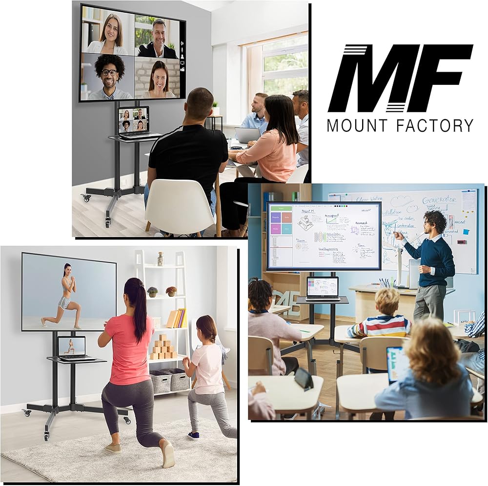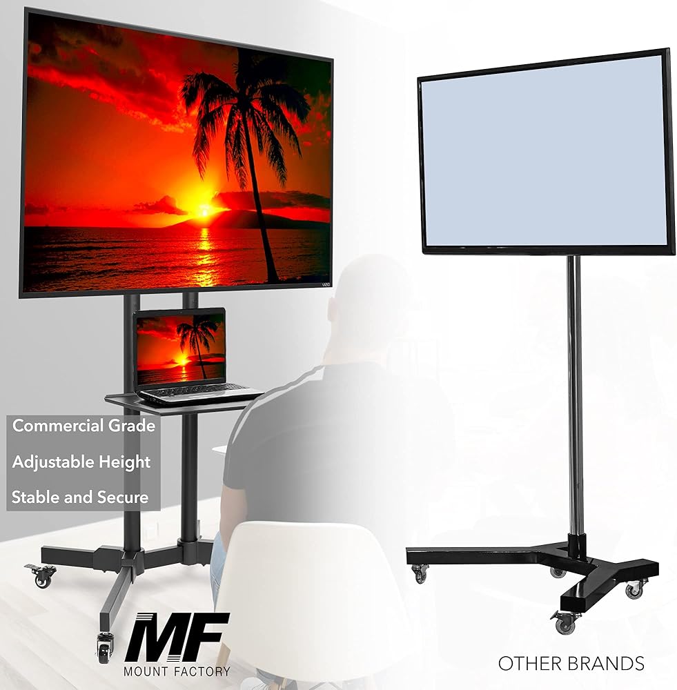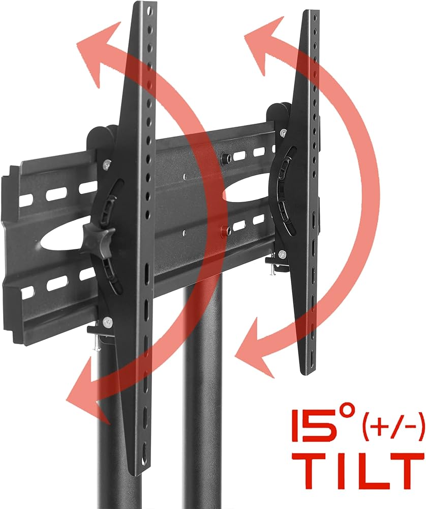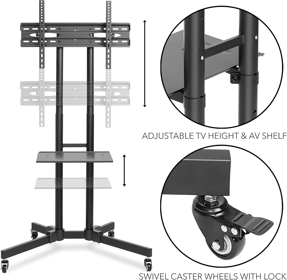 This premium rolling cart has the ability to move your TV or monitor to any room in your home or office. This unit is designed to universally fit most LED, LCD, Plasma TVs and other flat panel displays from 32" to 65". This television mount utilizes the standard VESA patterns installed in almost all flat screen TVs with a range of 200mm x 200mm up to 600mm x 400mm (23.6" horizontally and 16" vertically max). The height of the display (center of the TV) is adjustable from 43" to 63" in 4" increments. Constructed from commercial-grade, heavy-duty steel, this rolling mount is rated with a capacity up to 110 pounds. A convenient, height adjustable component shelf is made to hold a cable box, game console, DVD player, or any other similar device under 22 pounds (measures 18" x 11-3/4"). This movable cart is loaded with safety features such as an extra wide base measuring 35-1/4" x 25-1/2" for stability and security and bolts that lock your TV in place to protect against accidental shifting. The four wheels are swiveling casters that roll smoothly and the back two wheels are built with a locking mechanism for safety and stability. Convenient openings in the back plate provide space to pass cables and wires through for a clean and uncluttered look. Step by step instructions will guide the simple assembly and installation process. Certifications: RoHS, CE and ISO-9001.