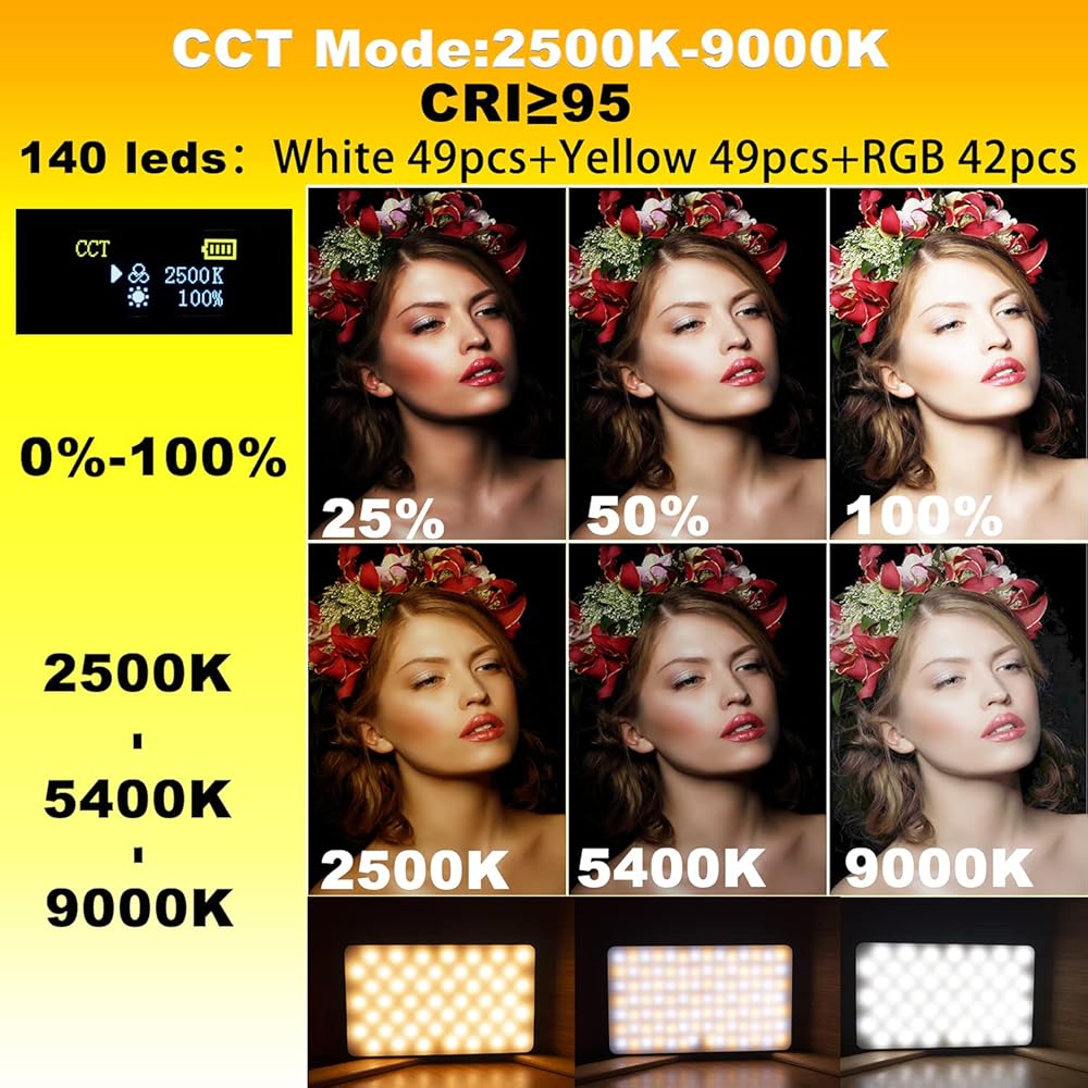 【RGB LED video light】 portable 360° colour photography light. The light has 140 pieces of lamp beads (white 49 pieces + yellow 49 pieces + RGB 42 pieces). Continuous light CRI95+, brightness range 0-100%, colour temperature 2500-9000k, cold and warm white light can be adjusted as desired. The RGB video lighting uses LED screen to display brightness and colour temperature, convenient and clear