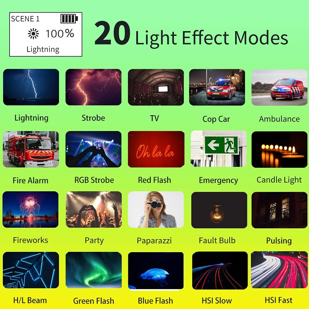 【Multifunctional camera light】 adjustable brightness in cold and warm white and selection in 20 effect mode, e.g. Cop car, lighting, party, RGB flash etc. You can adjust the brightness and scenes. No glare and the soft light does not dazzle
