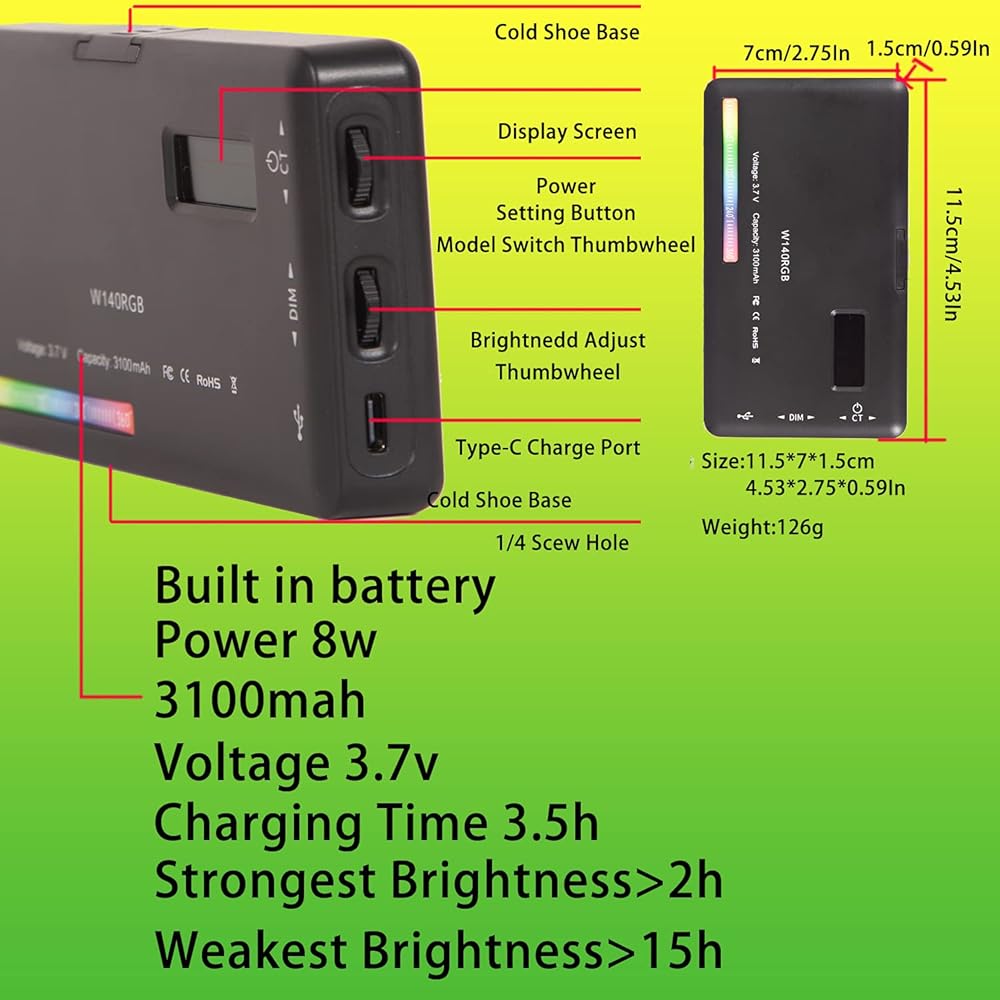 【Built-in lithium battery vlog light】 the battery capacity of the RGB video lighting is 3100 mAh. The camera lighting has a type C charging port, the RGB lighting power is 8W, the voltage is 3.7V, and the charging time is only 3.5 hours. The strongest brightness works for over 2 hours and the weakest brightness over 15 hours