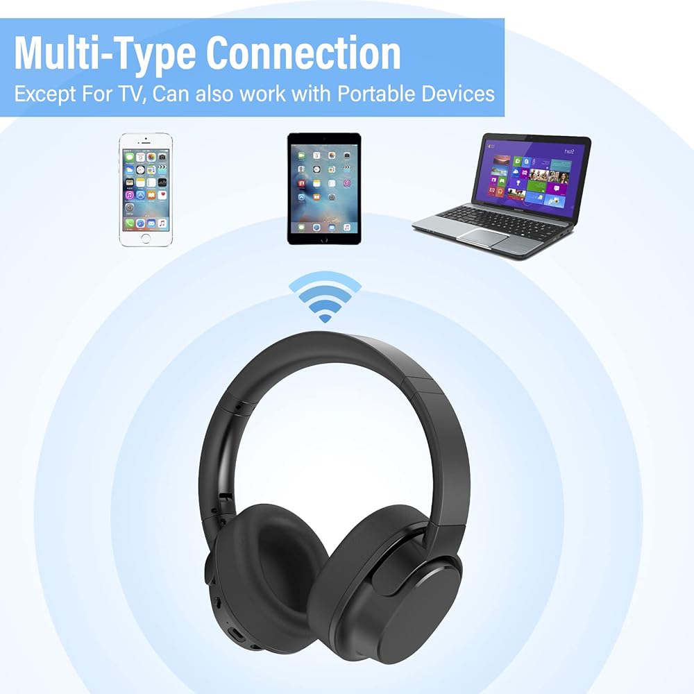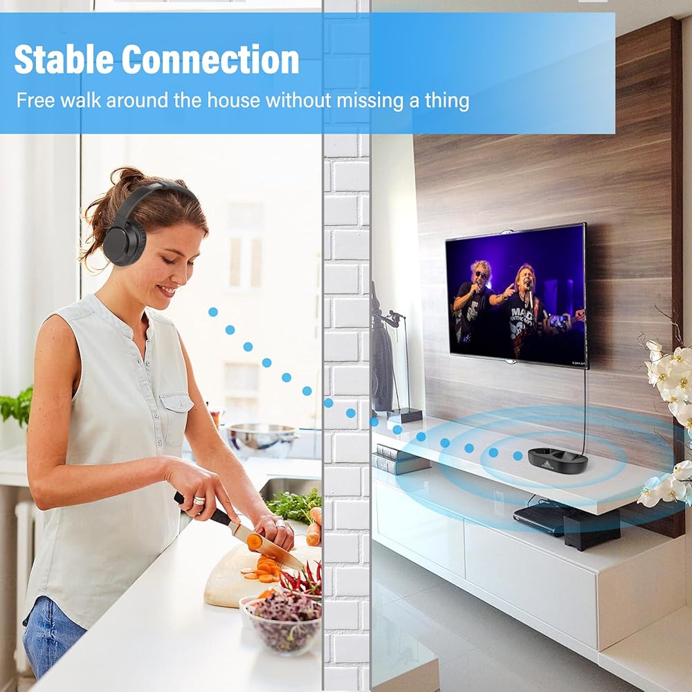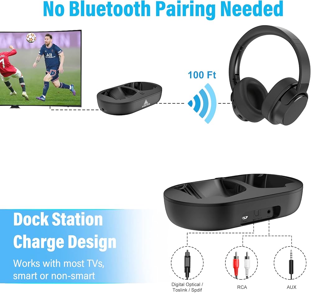 ๐บ๐งใEASY SET UP, MORE STABLEใWith the Bluetooth solution, these tv headphones wireless ensure stable & reliable connectivity of up to 100ft(30m), Let you be free to walk around the house with the headsets and do what you need to do without worrying about missing a thing.No need to pair, simply connect the transmitter dock to the power source and your TVs audio output port, power everything on, and they'll quickly connect with each other.