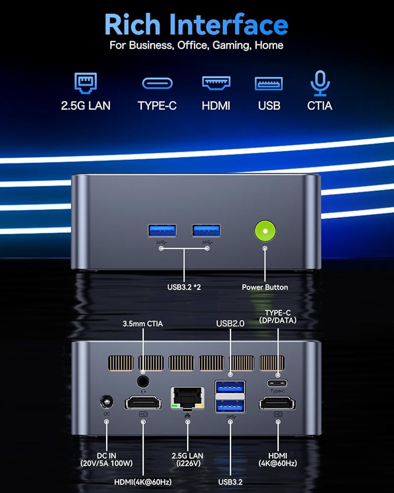 【Rich Interface & Small Form Factor】The mini desktop computers comes with 2 x HDMI 2.0 (4K@60Hz), 3 x USB 3.2, 1 x USB 2.0, 1 x DC Port, 1 x Type-C (Power/Data), 1 x LAN Port, 1 x Audio-in/out Jack ports. The size of the small computer is only 4.48x4.17x1.67 inches, easy to carry and organize on your desktop. Our complimentary VESA bracket can mount the micro pc on the wall or on the monitor.