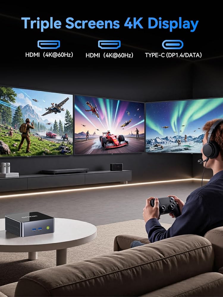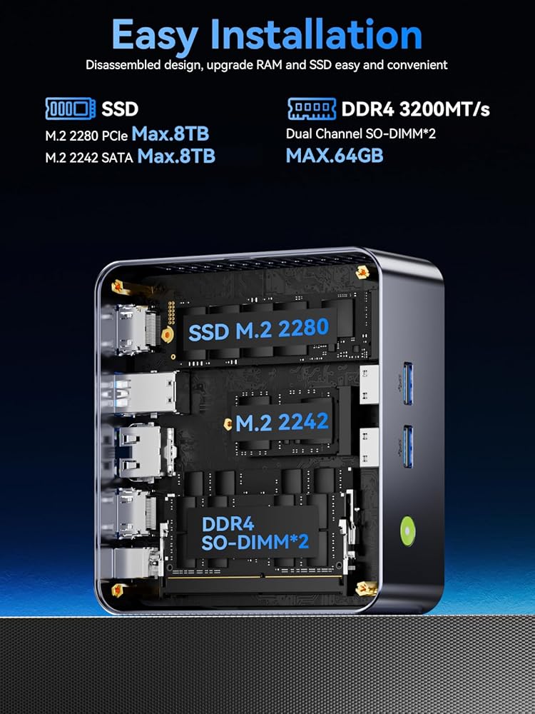 【16GB DDR4 Dual Channel RAM 512GB PCIe 3.0 SSD Drive】Equipped with fast Dual Channel 16GB (8GB*2) DDR4 supports expansion to 64GB (Not Included) and 512GB PCIe 3.0 M.2 2280 NVMe SSD Hard Drive, supports expansion to 2TB (Not Included). This mini computer runs faster than previous Core i5 / AMD Ryzen 5 processors and offers fast response whether it's gaming or rendering rich 3D graphics. Strong performance, perfect for daily use, such as business office, gaming entertainment, home theater, etc.