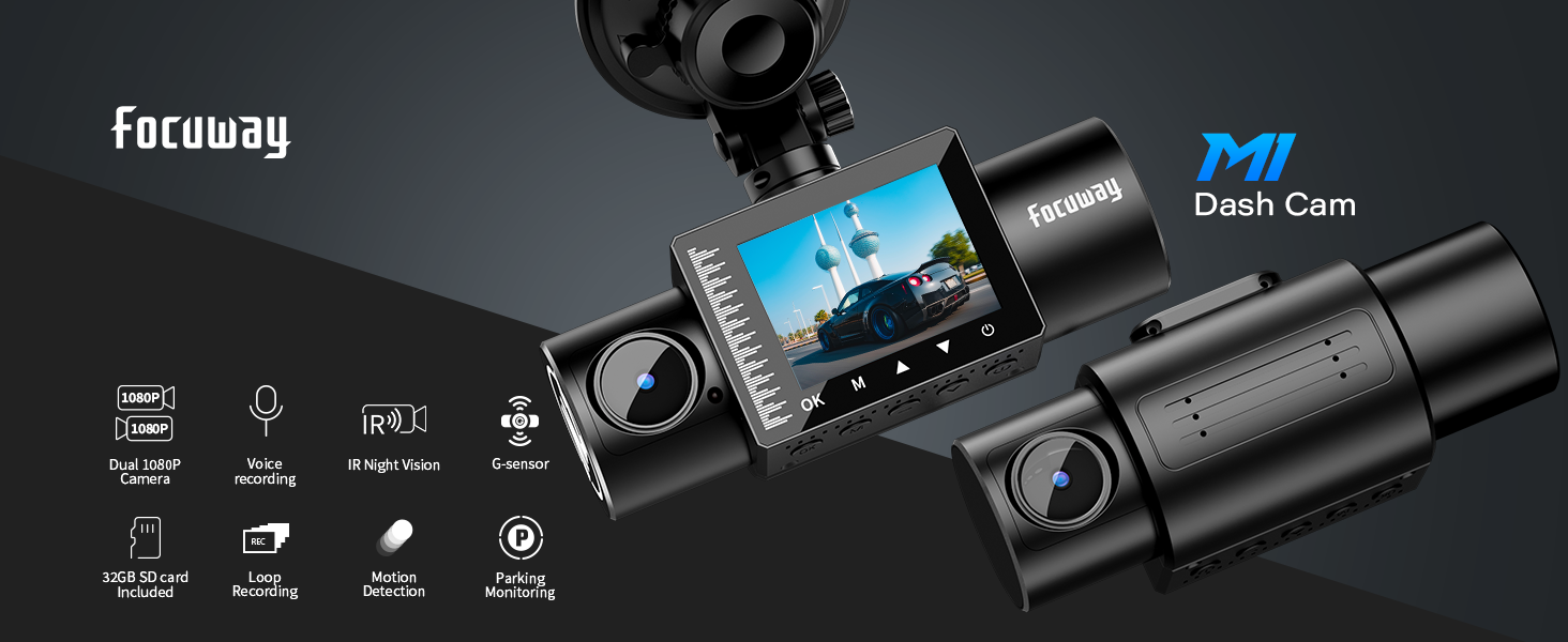 FocuWay Dash Cam Front and Rear Dual 1080P Two Channels with IR Night Vision Car Camera SD Card Included Dashboard Camera Dashcam for Cars HDR Motion Detection and G-Sensor for Car, Taxi