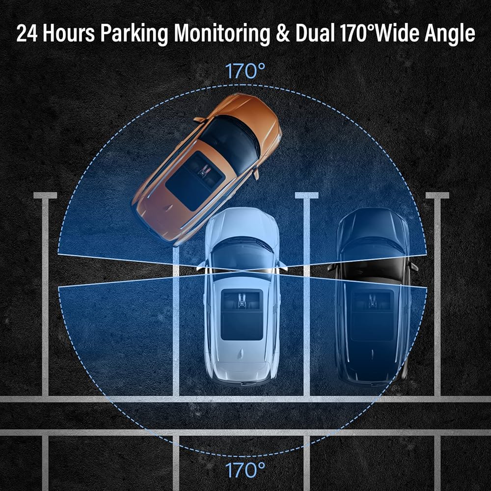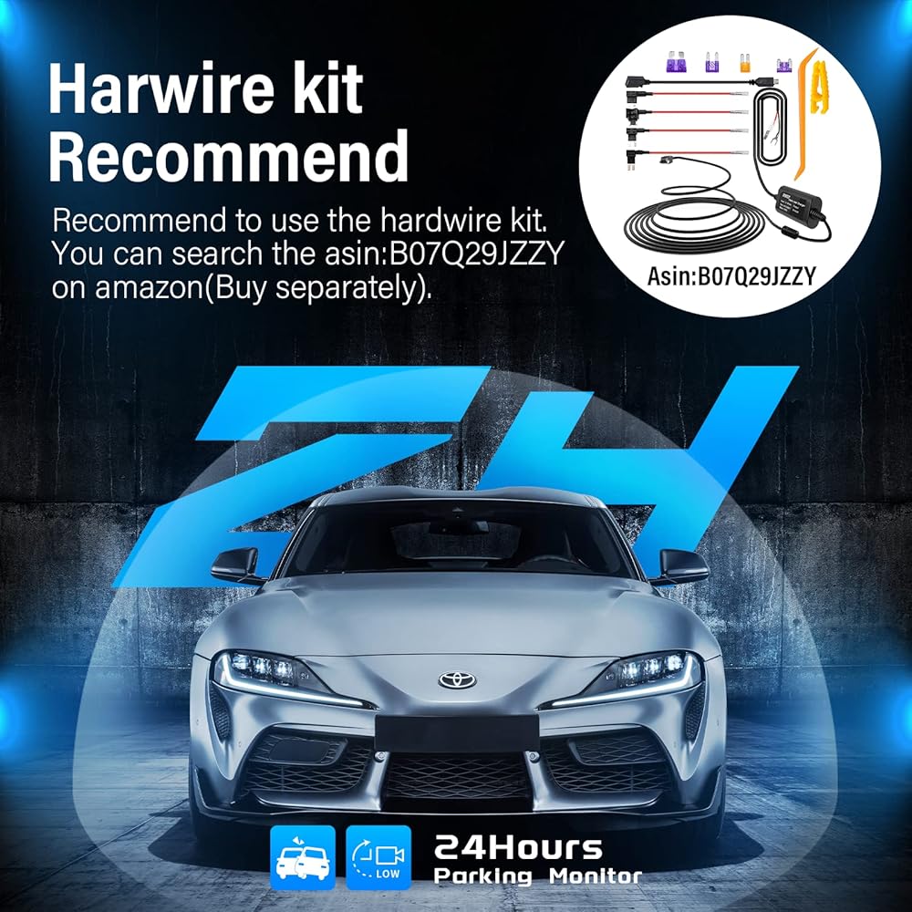 【Two Ways to Protect Your Car】The dash cam automatically powers on (Two cameras will turn on together) and starts recording as soon as impact is detected, thus providing you a video evidence if your car is scratched by someone in parking. Not like other dash cam, two channels never let off any corner. Hence ensuring your peace of mind with complete 24x7 monitoring of your car. We recommend to use the hard wire kit(Asin: B07Q29JZZY) installing your dashcam.