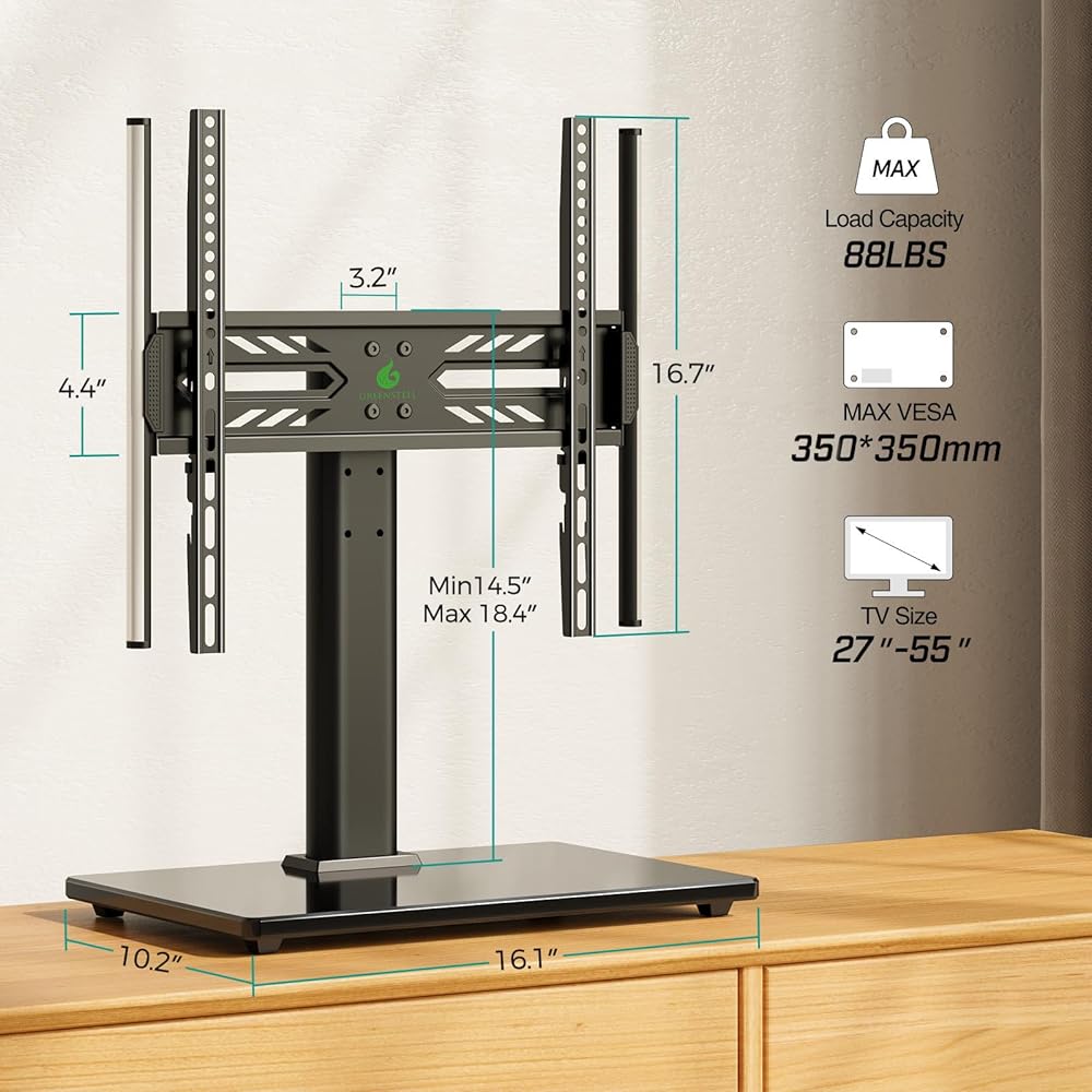 Universal Design: Greenstell universal table top TV stand fits 27-55 inch flat/curved TVs and holds up to 88lbs of weight. With VESA pattern sizes from 75x75mm, 100x100mm, 200x100mm, 200x200mm, 300x200mm, 300x300mm, 350x350mm, it is compatible with TV brands such as Samsung, Sony, Sharp, TCL, LG, Vizio, etc