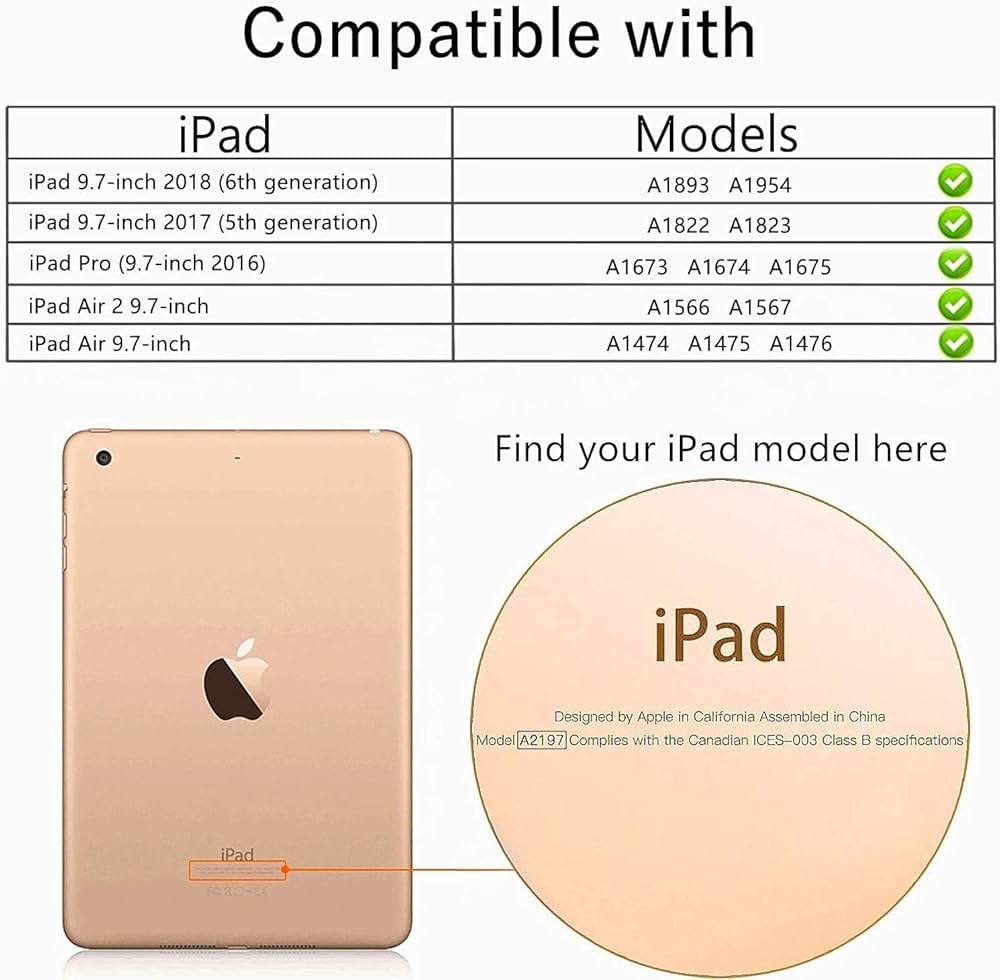 [Compatibility]: Designed exclusively for iPad 9.7 inch (iPad 6th Generation2018, iPad 5th Generation 2017, iPad Air 2, iPad Air and iPad Pro 9.7 Release. Model number: A1893 A1954/ A1822 A1823/ A1566 A1567/ A1474 A1475 A1476/ A1673 A1674 A1675. NOT compatible with other iPad models. Please check back bottom of your iPad to find the model number.