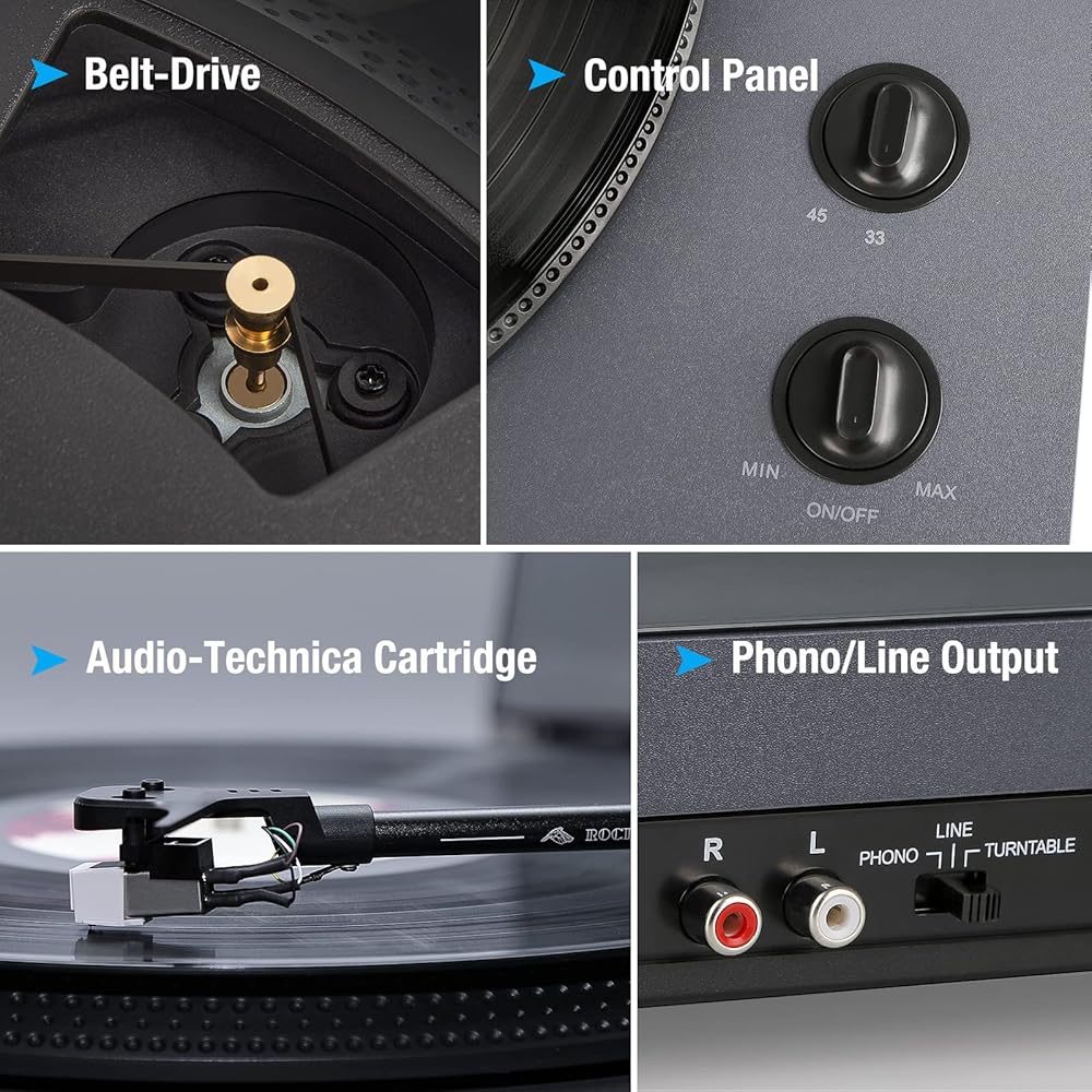 1 BY ONE Rock Pigeon Vinyl Record Player, Belt-Drive Turntable with Speakers, Built-in Phono Preamp, Moving Magnetic Cartridge AT-3600L, RCA Out, 2-Speed
