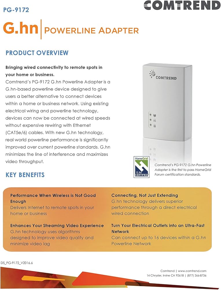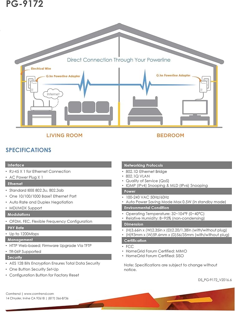 A second compatible powerline device is needed for this unit to work. Description Comtrend's PG-9172 G.hn Powerline Adapter is a G.hn-based powerline device designed to give users a better alternative to connect devices within a home or business network. Using existing electrical wiring and powerline technology, devices can now be connected at wired speeds without expensive rewiring and Ethernet (CAT5e/6) cables. With new G.hn technology, real world powerline performance is significantly improved over current powerline standards. G.hn minimizes the line of interference and maximizes video throughput. Features Advantages Delivers better real world performance than standard powerline technology. Enhances performance and video streaming using LDPC/FEC (Forward Error Correction) technology. Designed to work in high density environments (e.g. Apartments, business offices, condos, hotels, etc.) Supports an internationally recognized powerline standard (ITU-T) for true compatibility. Specifications Interface RJ-45 X 1 for Ethernet connection AC power plug X 1 Ethernet Standard IEEE 802.3u, 802.3ab One 10/100/1000 BaseT Ethernet Port Auto rate and duplex negotiation MDI/MDX support Modulations OFDM, FEC; Flexible frequency configuration Data Rate Up to 1200Mbps Management HTTP Web-based management; Firmware upgrade via TFTP TR-069 Supported (Optional) Security AES 128 Bits Encryption Ensures Total Data Security One Button Security Set-Up Configuration Button for Factory Reset Networking Protocols 802.1D Ethernet Bridge 802.1Q VLAN Quality of Service (QoS) IGMP(IPv4) Snooping & MLD(IPv6) Snooping Power 100-240 VAC 50Hz/60Hz Auto power saving mode max 0.5W (in standby mode) Environment Condition Operating temperature: 0 - 40 degrees Celsius Relative humidity: 8 - 95% (non-condensing) Dimensions (H)93mm x (W)59.6mm x (D)56/35mm (with/without plug) Certifications FCC Home Grid Forum.