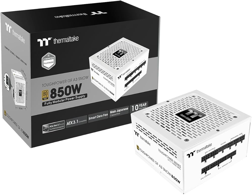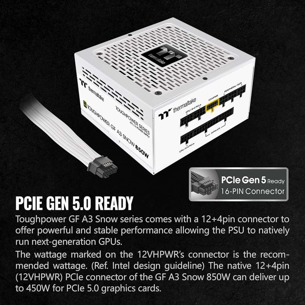 To fully support next-gen hardware, Toughpower GF A3 Snow Series (850W/1050W) is designed to meet ATX 3.0 standards, including a PCIe Gen 5.0 12VHPWR connector. The GF A3 Gold series delivers 80 PLUS Gold efficiency, it also offers stability, durability, and reliability. For users who crave for a pure white build, this power supply can definitely meet their demands. Toughpower GF A3 Snow Gold series is fully compatible with Intel ATX 3.0 Specifications which supports up to 200% power excursion, reaches 60% low load efficiency and complies with required power supply timing standards. Toughpower GF A3 Snow series comes with a 12+4pin connector to offer powerful and stable performance allowing the PSU to natively run next-generation GPUs. Toughpower GF A3 Snow series features a 120mm fluid bearing fan to deliver excellent airflow. Furthermore, the Smart Zero Fan will the fan will not spin until the load exceeds 30% of the power supply, minimizing undesired noise. High quality Japanese main electrolytic capacitor greatly improves the power supplies durability and ensures the Toughpower GF A3 Snow series is stability and reliability.•P/N: PS-TPD-0850FNFAGU-N •MODEL: TTP-0850AH2FLG •TYPE: Digital •WATTS: 850W •MAX OUTPUT CAPACITY: 850W •COLOR: White •DIMENSIONS: 150mm(W)x86mm(H)x140mm(D) •PFC (POWER FACTOR CORRECTION): Active PFC •POWER GOOD SIGNAL: 100-150 msec •HOLD UP TIME: 17msec •INPUT CURRENT: 15A-8A •INPUT FREQUENCY RANGE: 50Hz/60Hz •INPUT VOLTAGE: 100-240V~ •OPERATING TEMPERTURE: +5°C to +40°C •OPERATING HUMIDITY: 20% to 85% •STORAGE TEMPERTURE: 40°C to +55°C •STORAGE HUMIDITY: 10% to 95% •COOLING SYSTEM: 12cm FDB Fan •EFFICIENCY: Meet 80 PLUS® Gold at 115Vac input. •MTBF: 100 •SAFETY APPROVAL: FCC/cTUVus •PCI-E 6+2PIN: 5 •PCI-E 12+4PIN:1(450W)