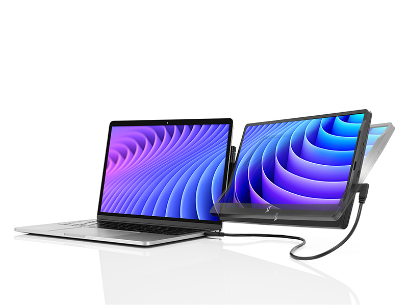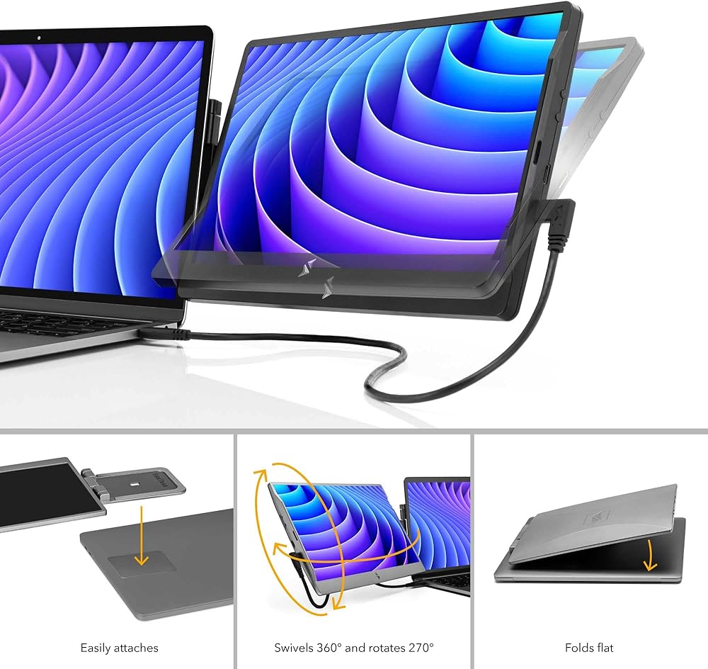 PORTABLE PRODUCTIVITY >> This portable monitor is lightweight, stays attached to your laptop with a hidden metal plate, and doesn't require a table for support, allowing you to work anywhere two screens.
