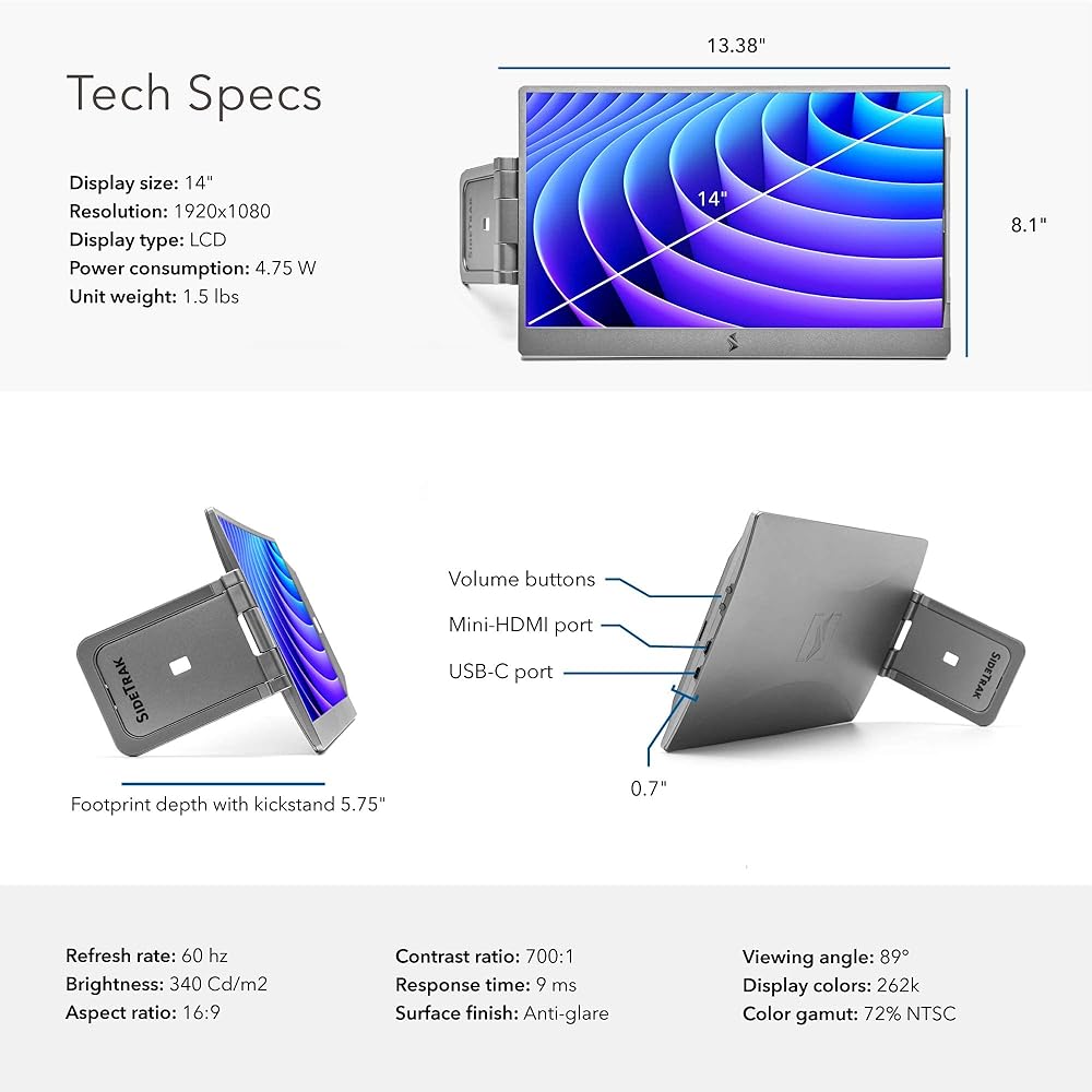 EXCEPTIONAL PICTURE QUALITY & SLEEK DESIGN >> Designed with an extra-large 14'' screen, ultra-thin bezels, and exceptional full HD picture quality, the SideTrak Swivel portable laptop monitor offers stunning visuals from anywhere.