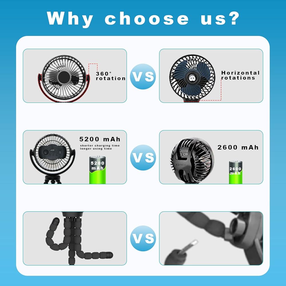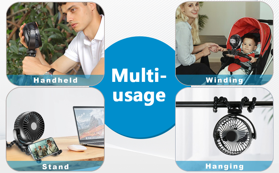 【360° Rotatable & Flexible Tripod】The stroller fan's head is adjustable for any angle to circulate air from desired direction,with sturdy flexible tripod,you can clip this small Octopus fan on your baby stroller, crib, beach umbrella, car seat, tent,set it stand as desk fan,or as handheld fan.