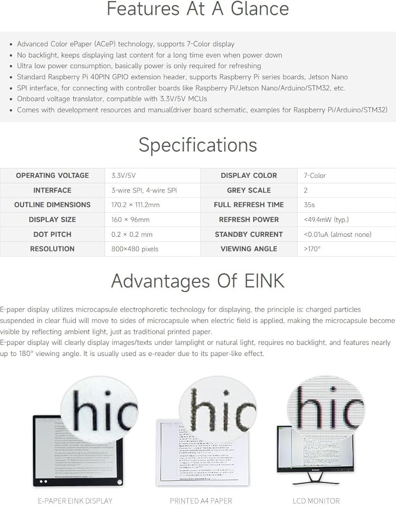 - Advanced Color ePaper (ACeP) technology, supports 7-Color display. No backlight, keeps displaying last content for a long time even when power down
