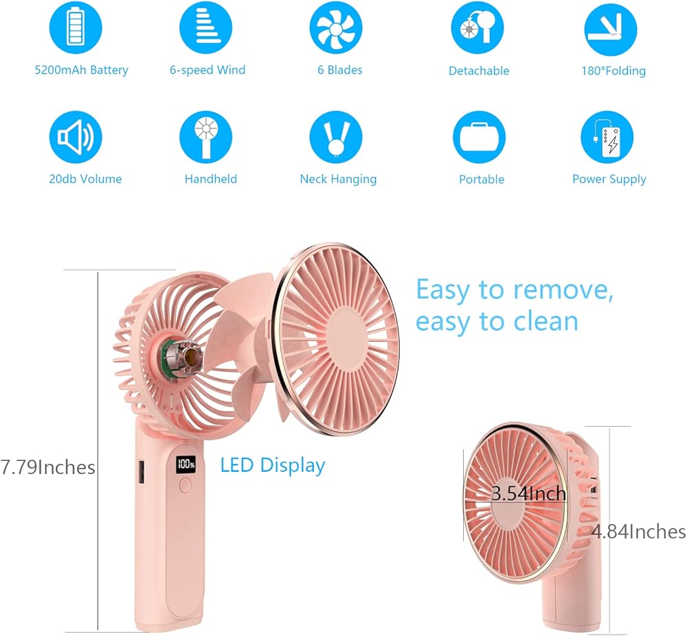 صغيرة الحجم وسهلة التنظيف. تتميز هذه المروحة بتصميم مريح ليس فقط للحمل في يدك، ولكنها أيضًا خفيفة الوزن وصغيرة الحجم، مما يجعل من السهل حملها في جيبك أو حقيبتك. يمكن تعديلها إلى أي زاوية للحصول على أقصى قدر من الراحة، ويمكن إزالة الغطاء الأمامي للمروحة بسهولة لتنظيف الغبار والأوساخ من الشفرات. كما أنه مقاوم للماء حتى تتمكن من تنظيفه بسهولة.
