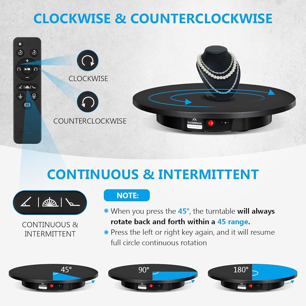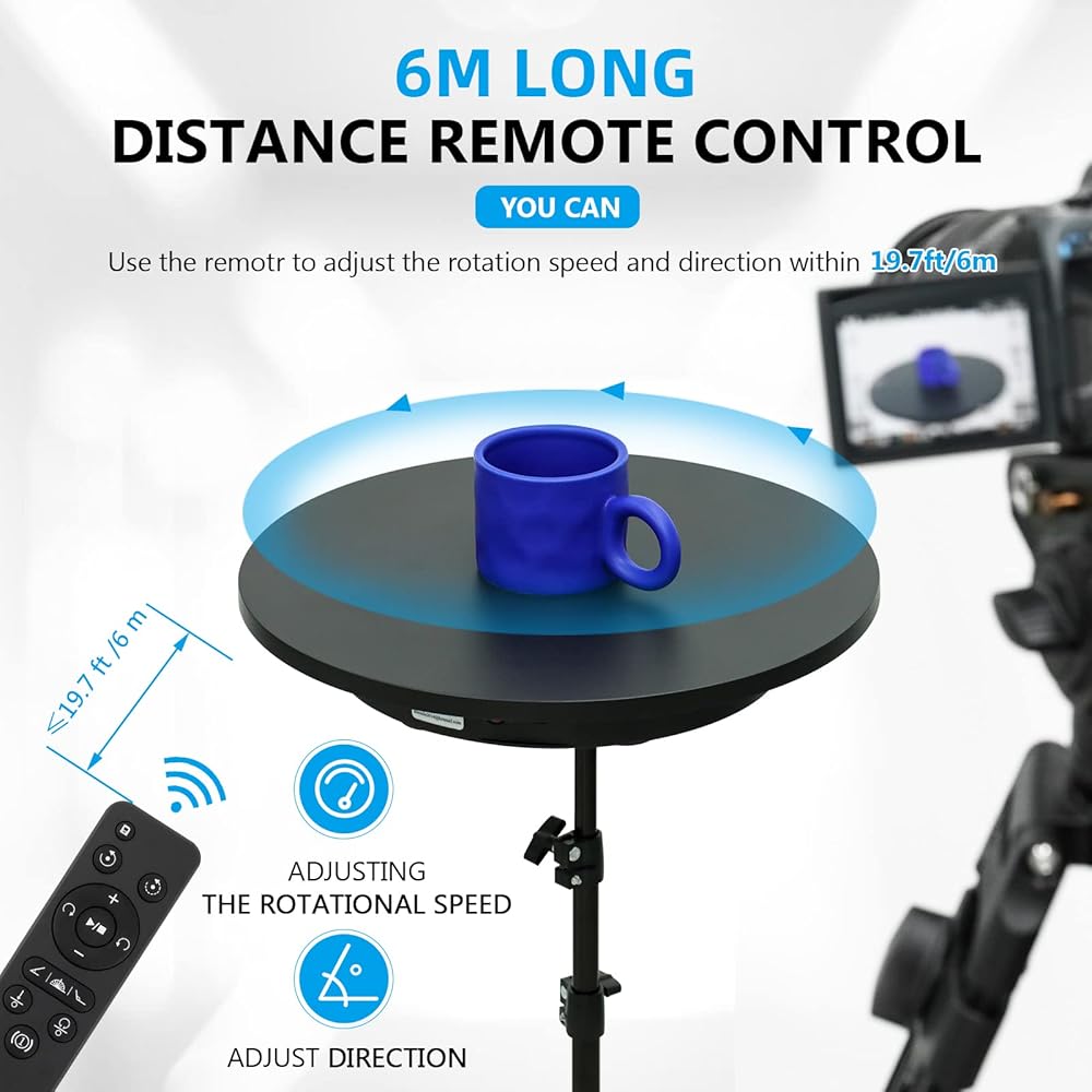 MULTIPLE ROTATION SPEEDS AND DIRECTIONS - You can remotely adjusting the rotation speed (22-60 sec/rev.) and direction by remote control under 19.7ft/6m. Electric turntable can do counterclockwise or clockwise rotation, do continuous or intermittent rotation. Great for captivating video shots of inanimate or boring items!